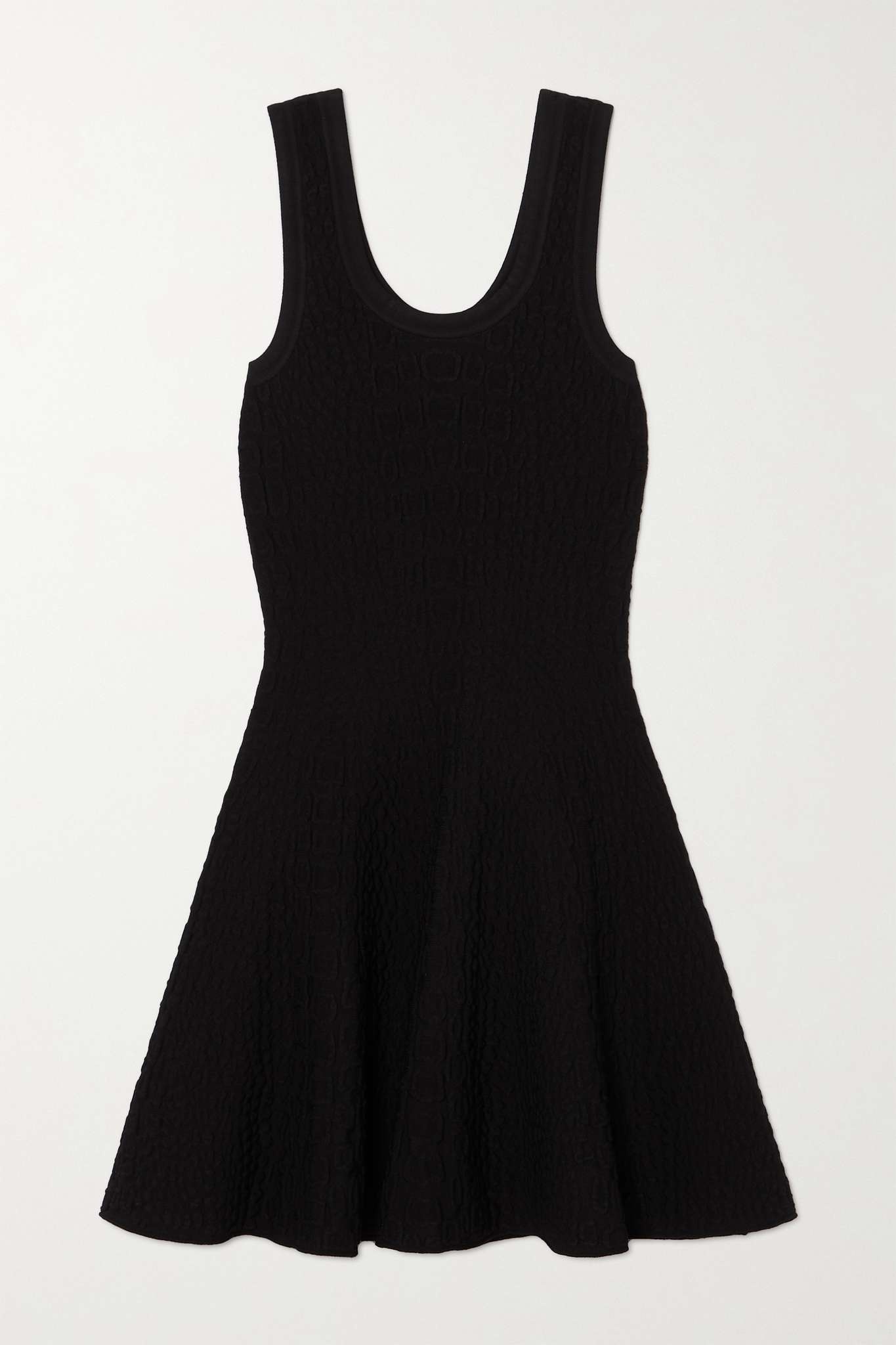 EDITORS'NOTES Alaïa spotlights iconic styles from its archives with its 'Archetypes' collection. Nodding to the brand's signature skater styles which first debuted in 1992, this pointelle-knit mini dress has a scooped neckline, nipped-in waist and flouncy gathered skirt. SIZE & FIT - Fits true to size, take your normal size - Designed to be fitted at the bust and waist, loose at the hip - Fine knit - Model is 177cm/ 5'10" and is wearing a FR 36 DETAILS & CARE - Black pointelle-knit - Slips on - 76% viscose, 16% polyester, 7% polyamide, 1% polyurethane - Dry clean