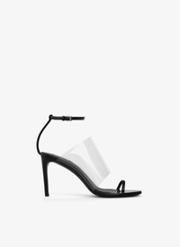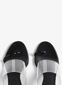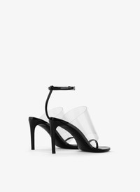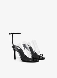 Asymmetrical heel sandals Thin asymmetrical leather toe strap, large transversal plexi strap and leather ankle strap on the right foot Calfskin with transparent polyuretane Heel height: 90 mm Made in italy DETAILS MAIN LINING: 100% LAMBSKIN SOLE: 80% CALFSKIN LEATHER 20% RUBBER UPPER MATERIAL 1: 90% POLYURETHANE 10% CALFSKIN LEATHER PRODUCT REFERENCE: AA3S116CK299 - 999