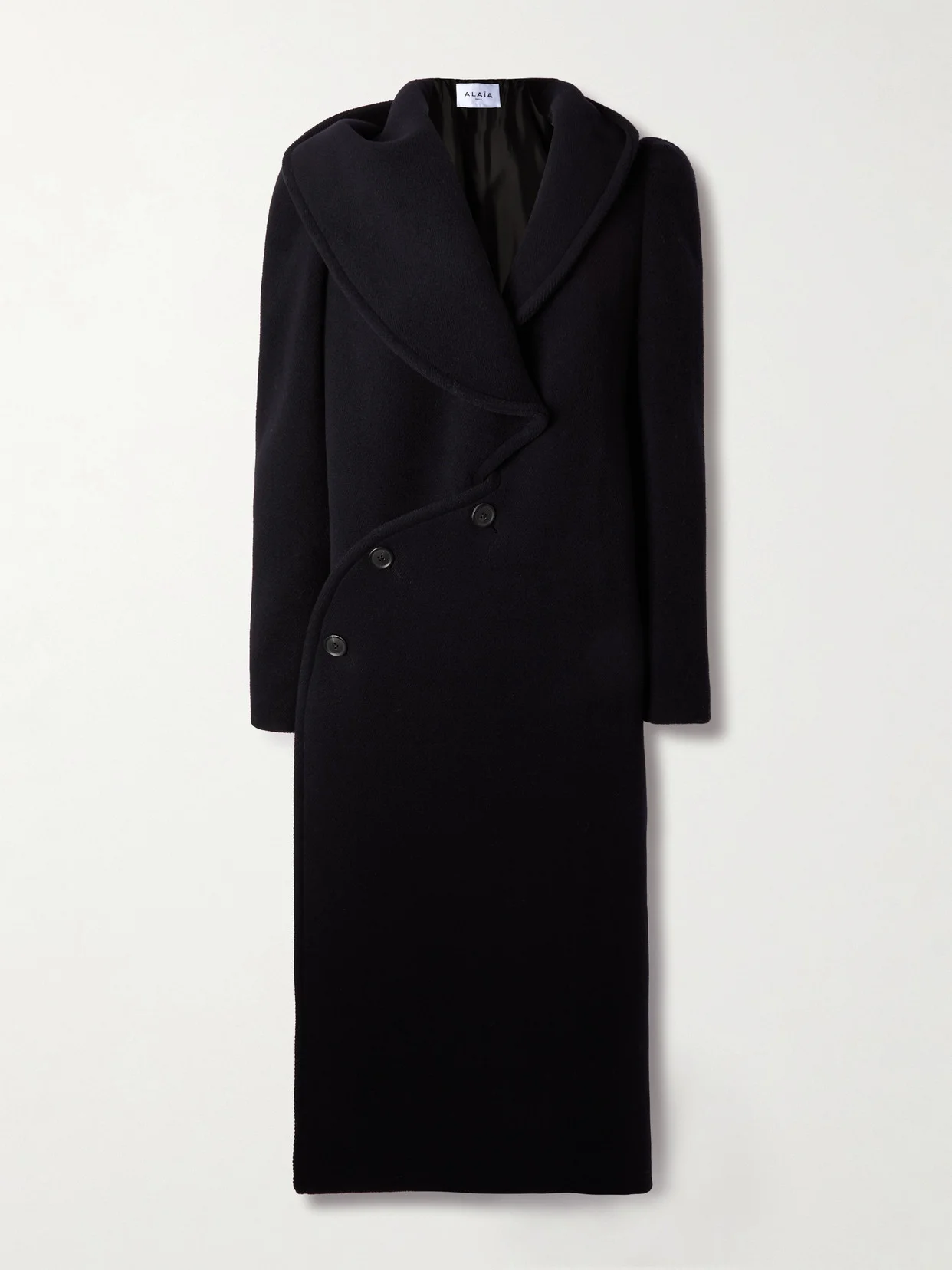 Alaia reimagines the familiar, transforming traditional shapes through sculptural forms and precise construction. This coat is tailored from wool and has an asymmetric draped front with a curved placket. The generous hood is meant to "frame the face like a portrait"; while the padded shoulders offer structure.