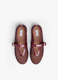Signature Alaia ballet flats inspired by classical Japanese shoes Buckle strap on top, round toes, rubber sole Fishnet textile & patent leather Made in Italy DETAILS MAIN LINING:100%LAMBSKIN SOLE:100% RUBBER UPPER MATERIAL 1:90% POLYAMIDE 10% CALFSKIN LEATHER BUCKLE:100% ZAMAK PRODUCT REFERENCE : AA3A029TK007 - 325