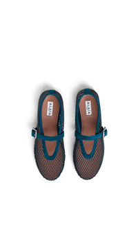 DETAILS Signature Alaia ballet flats inspired by classical Japanese shoes Buckle strap on top Rubber sole Fishnet textile and suede goatskin leather Made in Italy MATERIALS MAIN MATERIAL: 50% POLYAMIDE, 50% POLYESTER SECONDARY MATERIAL: 100% GOAT SUEDE LEATHER MAIN LINING: 100% GOAT SUEDE LEATHER OUTER SOLE: 100% RUBBER BUCKLE: 100% ZAMAK PRODUCT REFERENCE: AA3A029TK061-A53