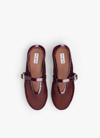 Signature Alaia ballet flats inspired by classical Japanese shoes Buckle strap on top, round toes, rubber sole Velvet effect flocked fishnet & patent calfskin Made in Italy DETAILS MAIN MATERIAL : 90% POLYAMIDE SECONDARY MATERIAL : 10% CALFSKIN LEATHER MAIN LINING : 100% LAMBSKIN LEATHER SOLE : 100% RUBBER BUCKLE : 100% ZAMAK PRODUCT REFERENCE : AA3A029A015-325