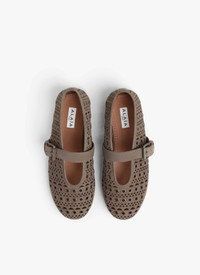 Signature Alaia ballet flats inspired by classical Japanese shoes Buckle strap on top, round toes, rubber sole Suede goatskin leather perforated with the iconic "Vienne" motif and embellished with eyelets Made in italy DETAILS MAIN MATERIAL : 100% GOATSKIN LEATHER MAIN LINING : 95% LAMBSKIN LEATHER SECONDARY MATERIAL : 5% GOATSKIN LEATHER MAIN APPLICATION : 100% BRASS SOLE : 100% LAMBSKIN LEATHER BUCKLE : 100% ZAMAK PRODUCT REFERENCE : AA3A029I059-809