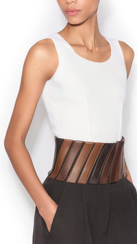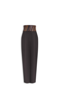 DETAILS Belted pants in wool gabardine Tailored fit, regular straight leg, high waist with zip fly and button Side seam pockets, one back welt pocket Integrated leather twisted belt with velcro adhesive tape, front pleats Made in Italy MATERIALS Highlights MAIN MATERIAL: 100% WOOL WAISTBAND: 100% LAMBSKIN LEATHER POCKET LINING: 100% COTTON PRODUCT REFERENCE: AA9P1302T612C-994