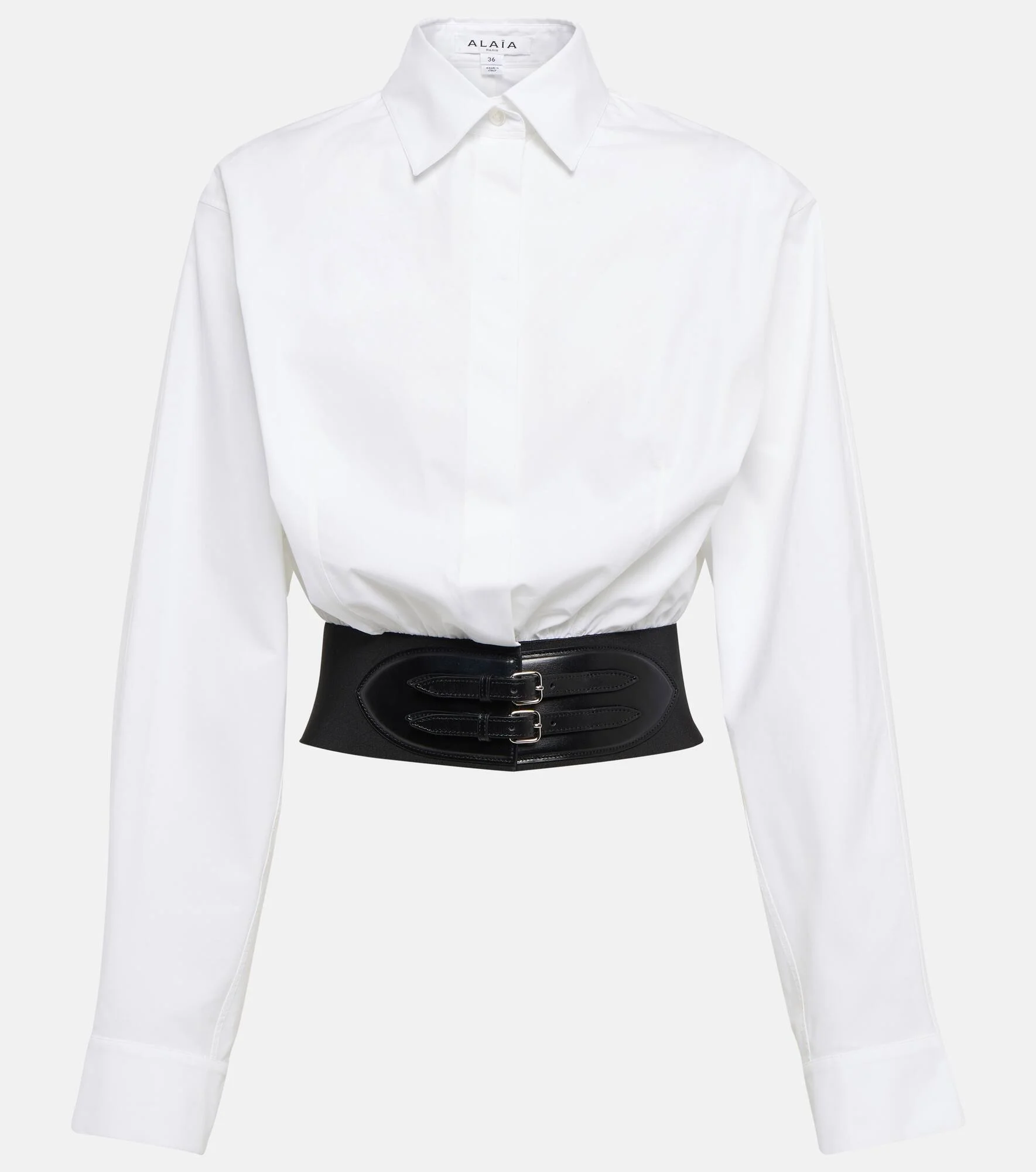 This shirt from Alaïa is made from cotton poplin. It has a pointed collar and a contrasting hem with two buckled belt straps. Product Details - Material II: 72% polyamide, 28% elastane - Material III: 100% calf leather - Made in Italy - Designer color name: Blanc - Closure: buttoned front - Care instructions: specialist clean - Material: 100% cotton - Contains non-textile parts of animal origin - Item number: P00746499 Size & Fit - Fits large to size - we recommend trying one size smaller - Cinched waist - Mid-weight material - Cropped - The model seen in the picture is 178cm-5'10" and wearing a size FR 34