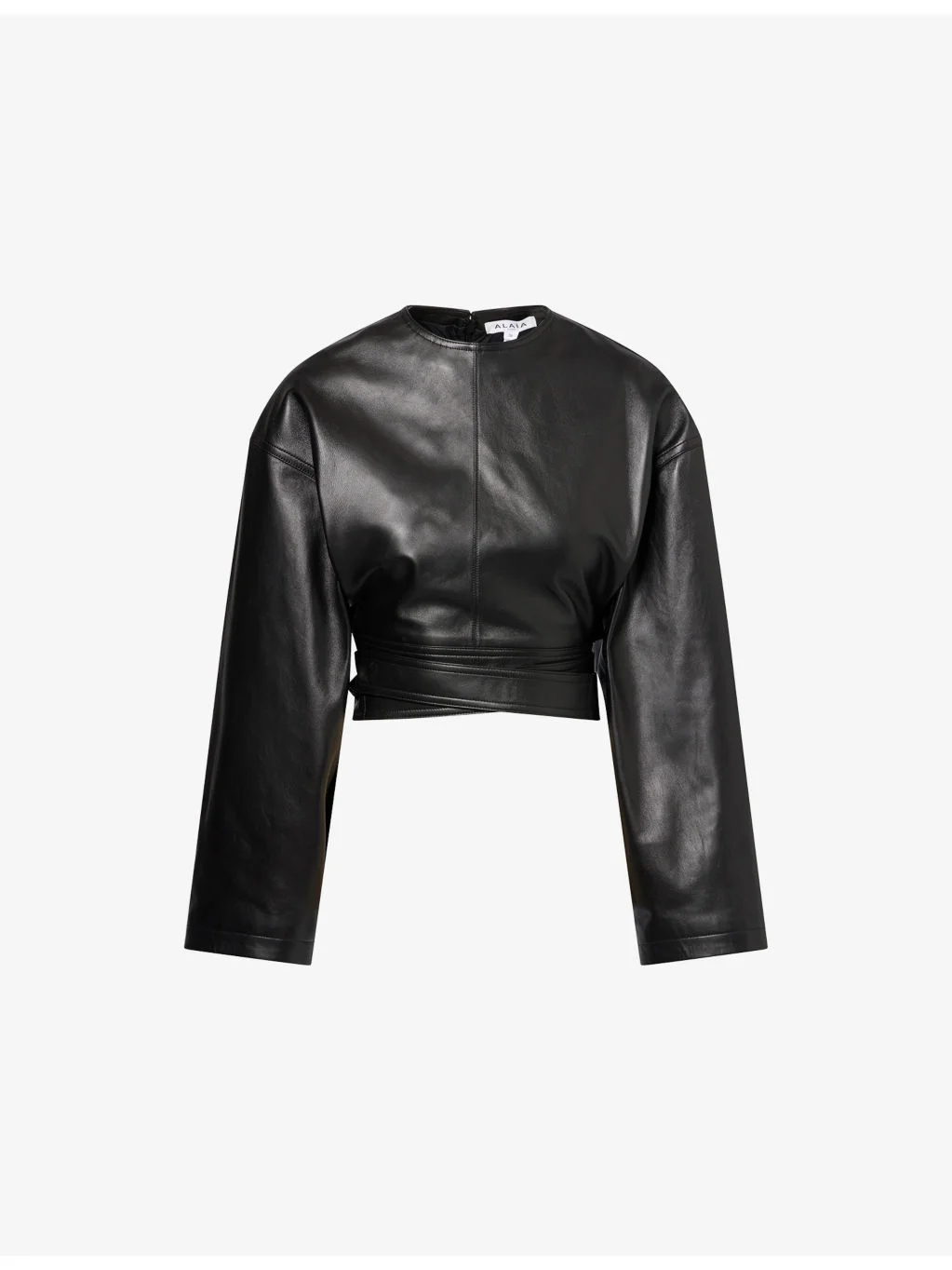 PRODUCT DETAILS - Alaia leather top - 100% leather; lining 100% polyamide - Concealed zip fastening at back - Regular fit, cropped length, long wide sleeves, round neck, self-tie belt at waist, fully lined - Specialist leather clean - Made in France - True to size - Model is 5ft 10in/1.78m and wears a size UK 8 - Midweight, non-stretch Ref: R04602241