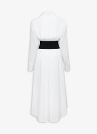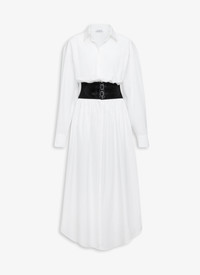 Belted shirt dress Classic shirt collar Round sleeves Long voluminous skirt Iconic elastic and leather belt Made from cotton poplin Made in Italy DETAILS COMPOSITION: 100% COTTON BELT: 100% CALF LEATHER, 72% POLYAMIDE/ POLYAMIDE, 28% ELASTANE PRODUCT REFERENCE: AA9R13426T611 - 000