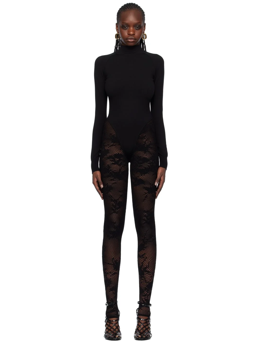 Wool-blend twill and stretch viscose-blend mesh jumpsuit. · Rib knit stand collar and cuffs · Floral pattern at legs · Concealed zip-closure at back Supplier color: Noir Body 1: 87% wool, 13% polyester. Body 2: 46% viscose, 41% polyamide, 10% polyester, 3% polyurethane. Made in Italy 241483F070000