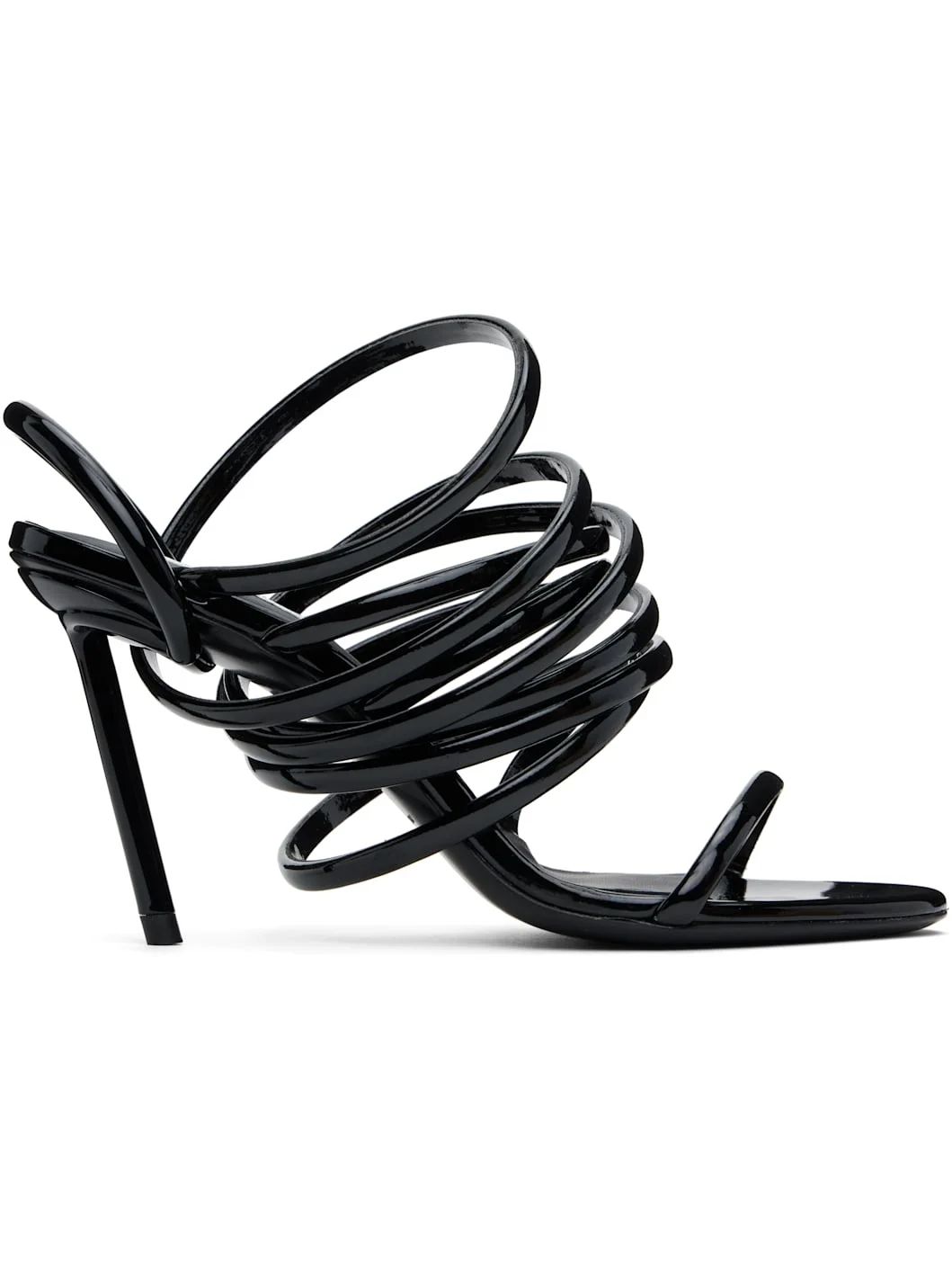 Patent calfskin heeled sandals in black. · Open toe · Wraparound straps at vamp · Logo patch at padded footbed · Buffed lambskin lining · Lacquered stiletto heel with rubber injection · Calfskin sole with rubber injection · Heel: H3.5" Supplier color: Noir Upper: calfskin. Sole: calfskin, rubber. Made in Italy 251483F125011