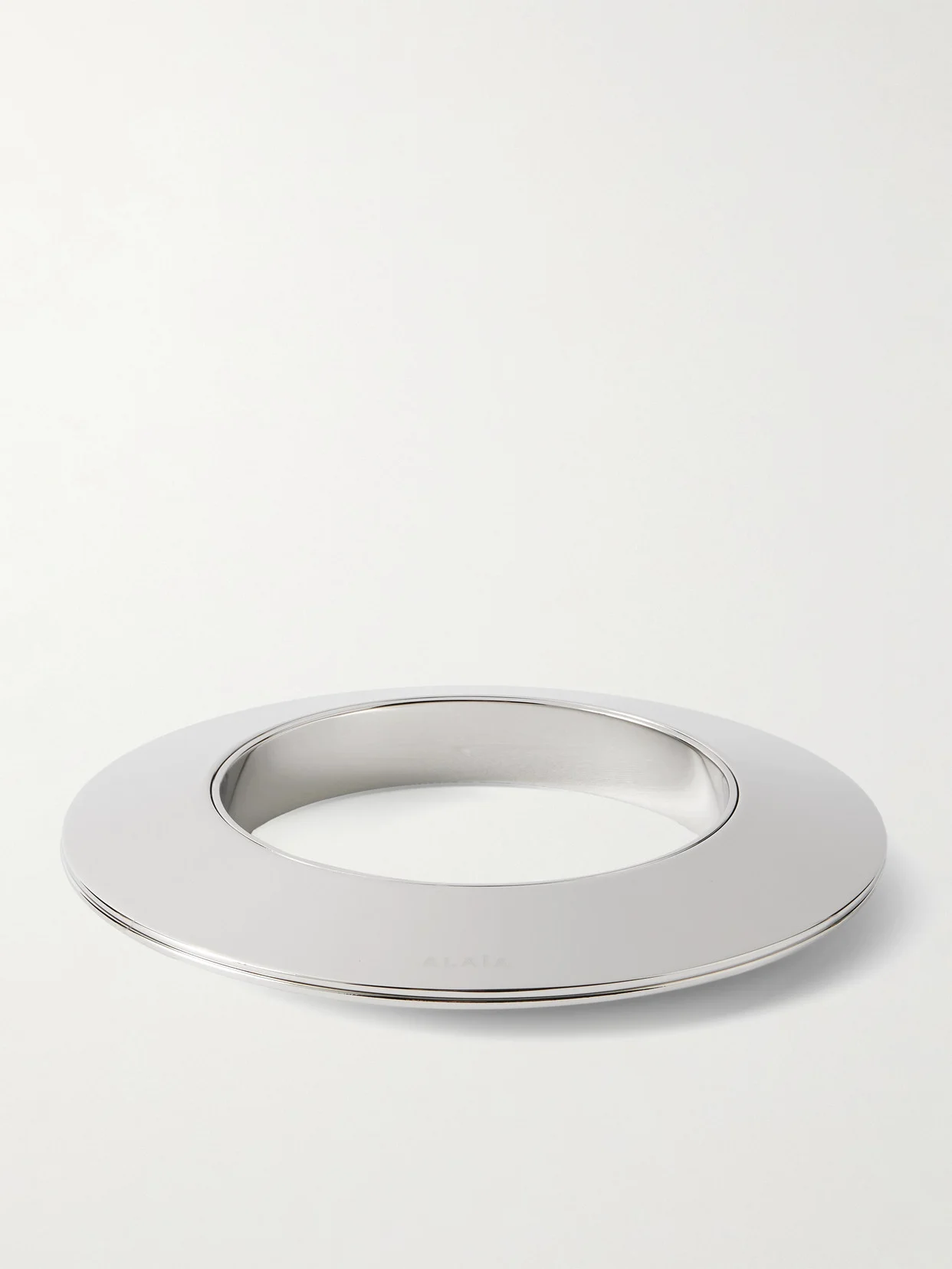 Form and sculpture inform Alaia's designs. This silver-tone bangle has a sculptural, disc-like shape that tapers towards the edges.
