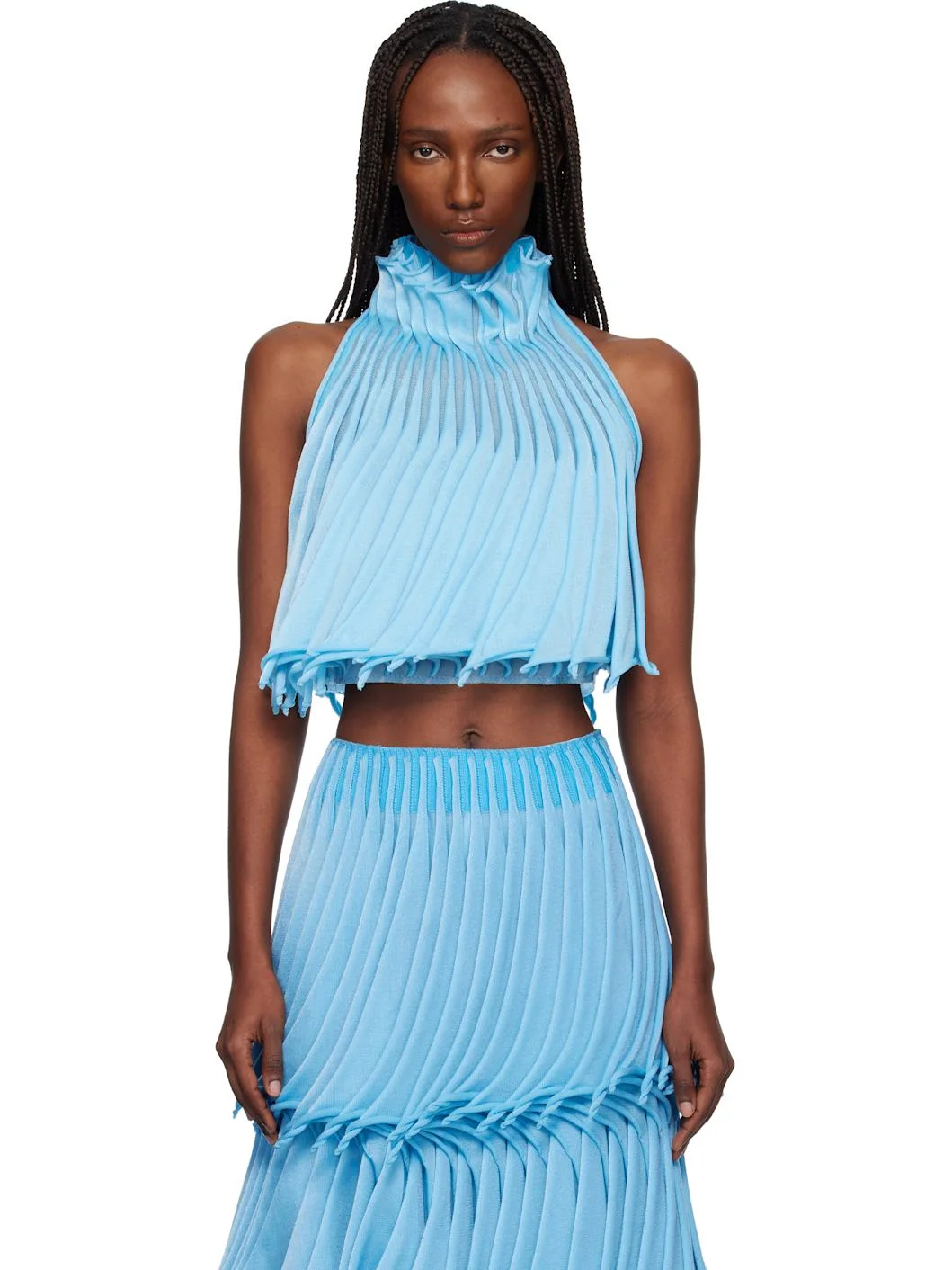 Pleated knit nylon-blend top. · Rolled edges throughout · Turtleneck · Cropped hem Supplier color: Glacier blue 55% polyamide, 45% polyester. Made in Italy 252483F111008