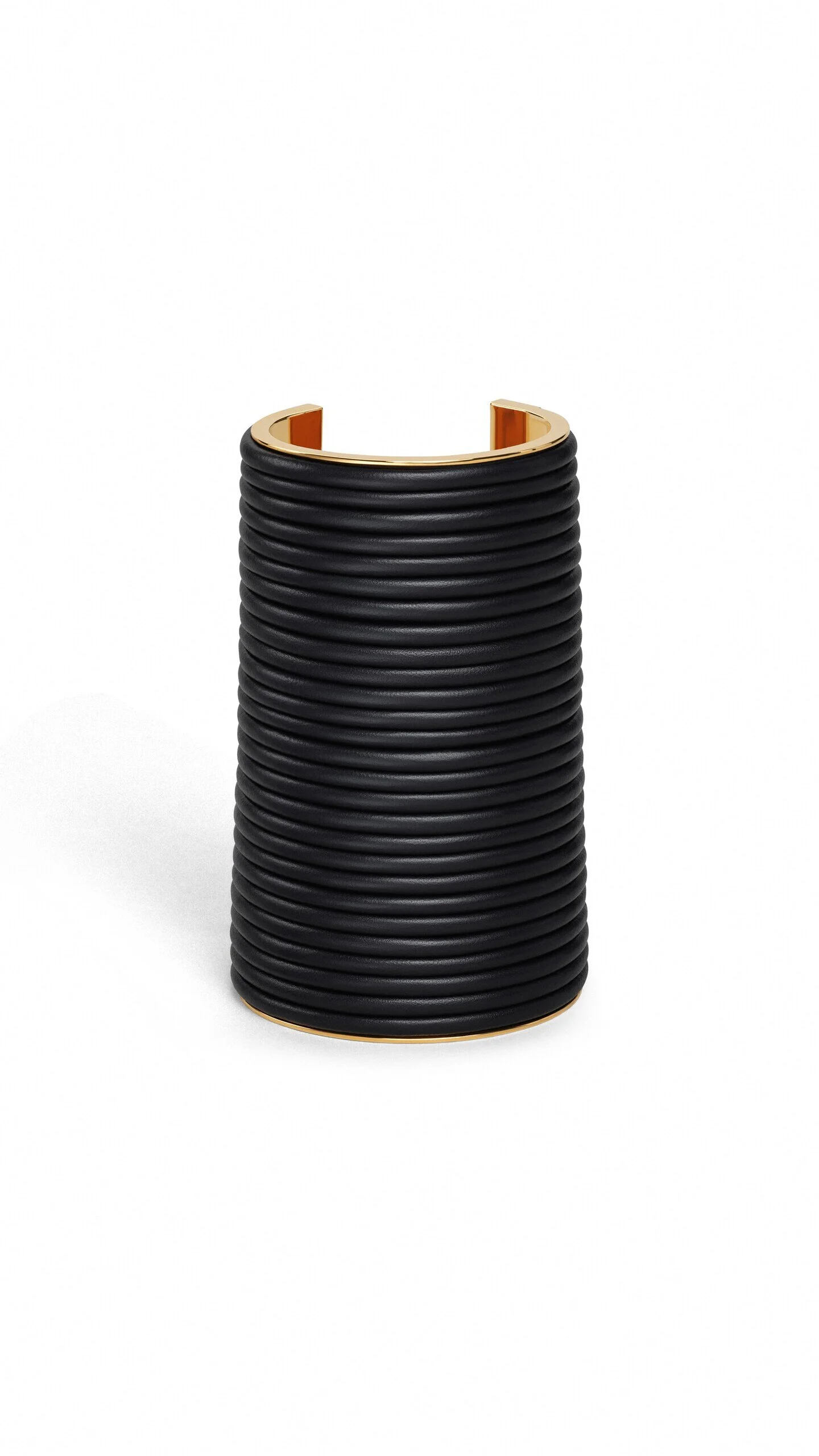 DETAILS Bi-material sculptural large cuff Gold plated brass structure Hand-wrapped round leather cord Diameter: 60 mm Width: 56 mm Made in Italy MATERIALS MAIN MATERIAL: 50% BRASS, 50% LAMB LEATHER PRODUCT REFERENCE: AAJB1032I228-573