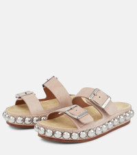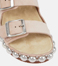 Earn style points from the ground up with Alaïa's Bombe slides. They're made from smooth beige suede with bulbous embellishments and pyramidal studs that perfectly match logo-engraved buckles. Product Details - Toe shape: round open toe - Lining: leather - Sole: leather insole, rubber sole - Trim: brass - Comes with a box - Designer color name: Chair - Made in Italy - Closure: buckle fastening - Upper: calf leather - Comes with dust bags - Item number: P00634997 Size & Fit - True to size - European sizes - 3cm-1" platform (size EU 38) - 3,5cm-1.5" wedge heel (size EU 38)