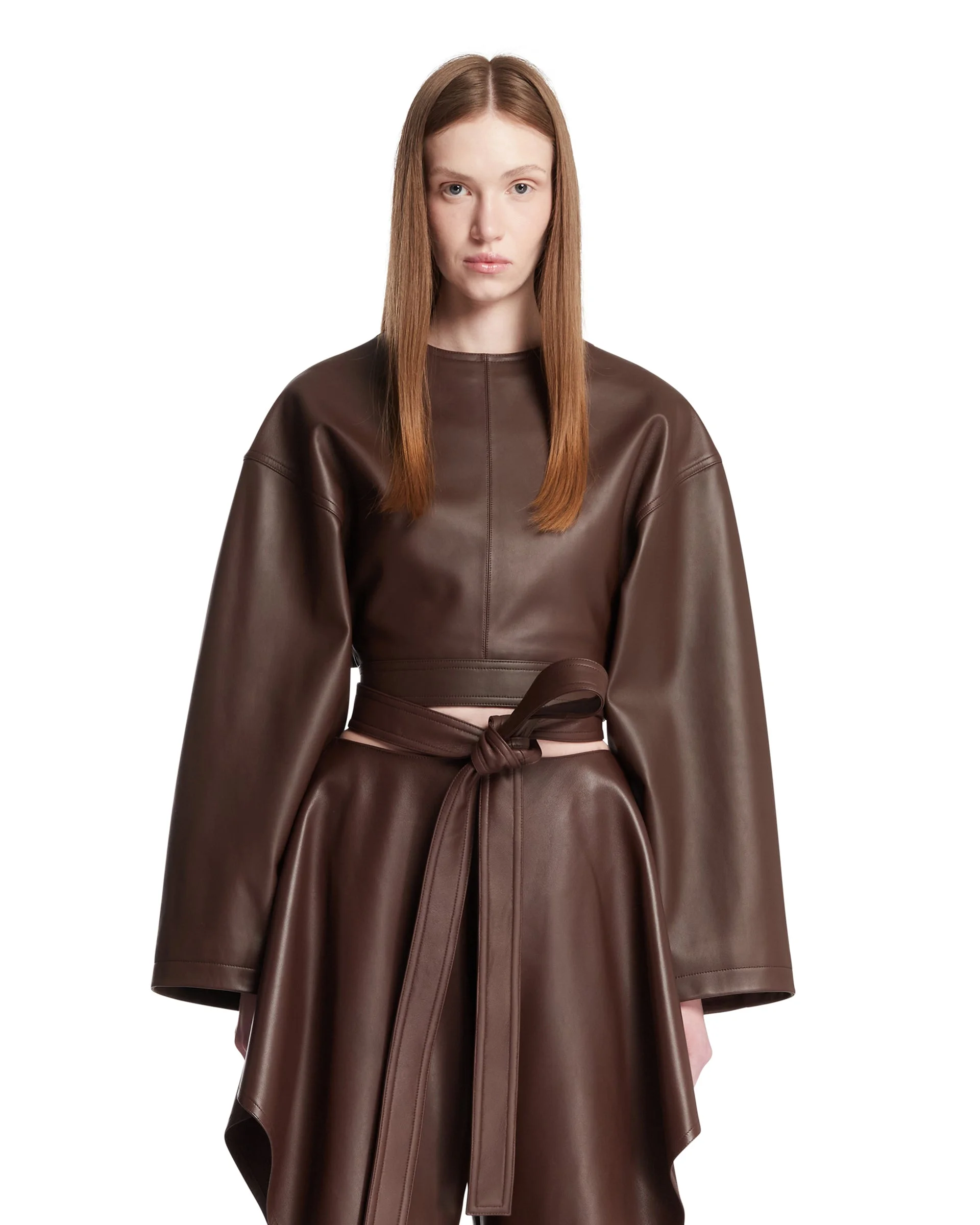 Alaia Brown Leather Belted Top. Brown leather, crewneck, dropped shoulders, long wide sleeves. Cropped design with belted hem. Yana is 178 cm and she is wearing size 36. DETAILS Model: AA9H1445C229C719 Composition: 100% Leather Made in: ITALY Season: SS26