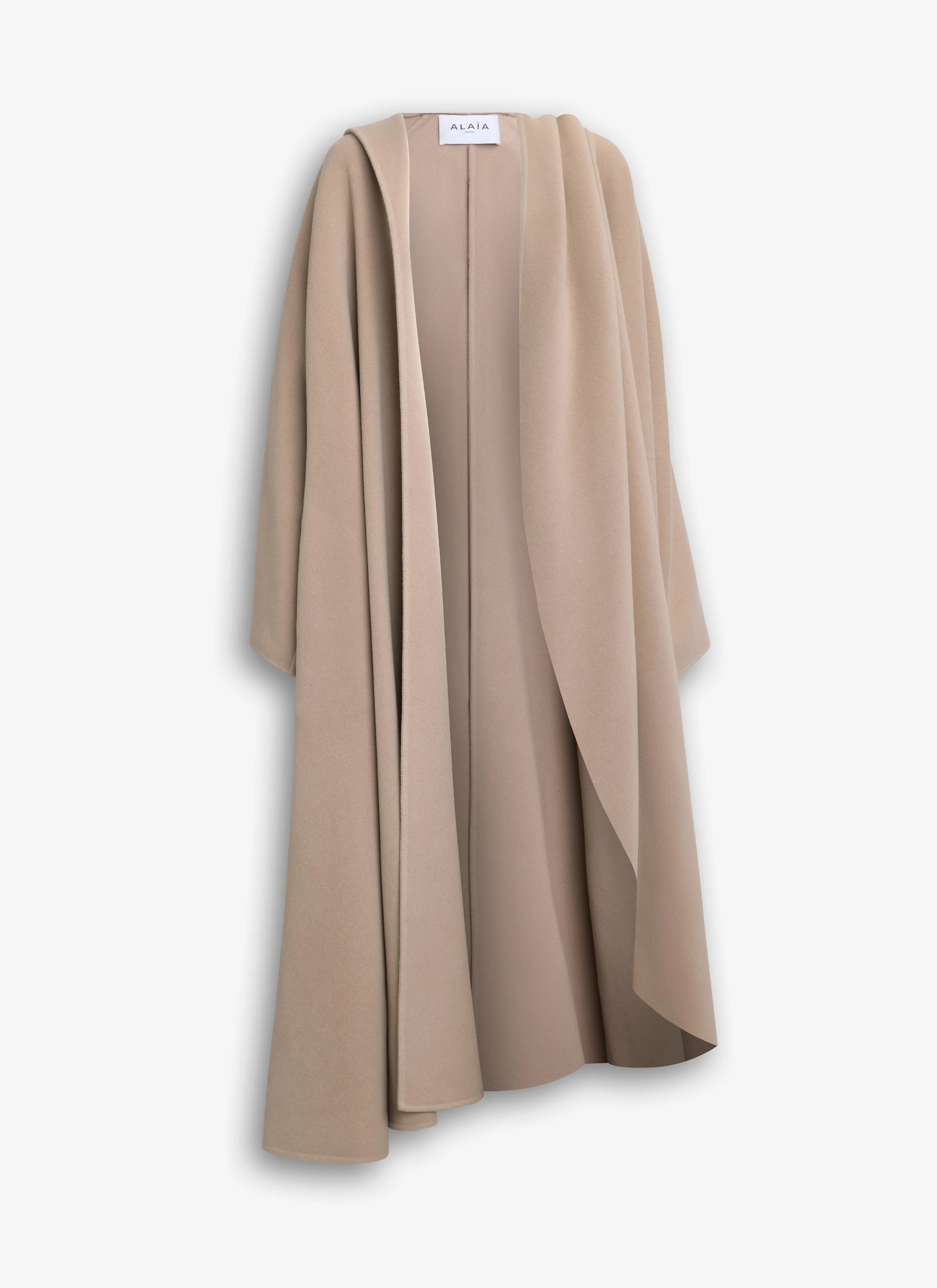 Hooded cape in double-sided blended cashmere and wool Large hood, shawl collar, wide sleeves, ankle length, back slit Tonal self-tie belt Trapeze shape Made in Italy DETAILS MAIN MATERIAL: 90% VIRGIN WOOL 10% CASHMERE WOOL PRODUCT REFERENCE: AA9M1044W027A - 143