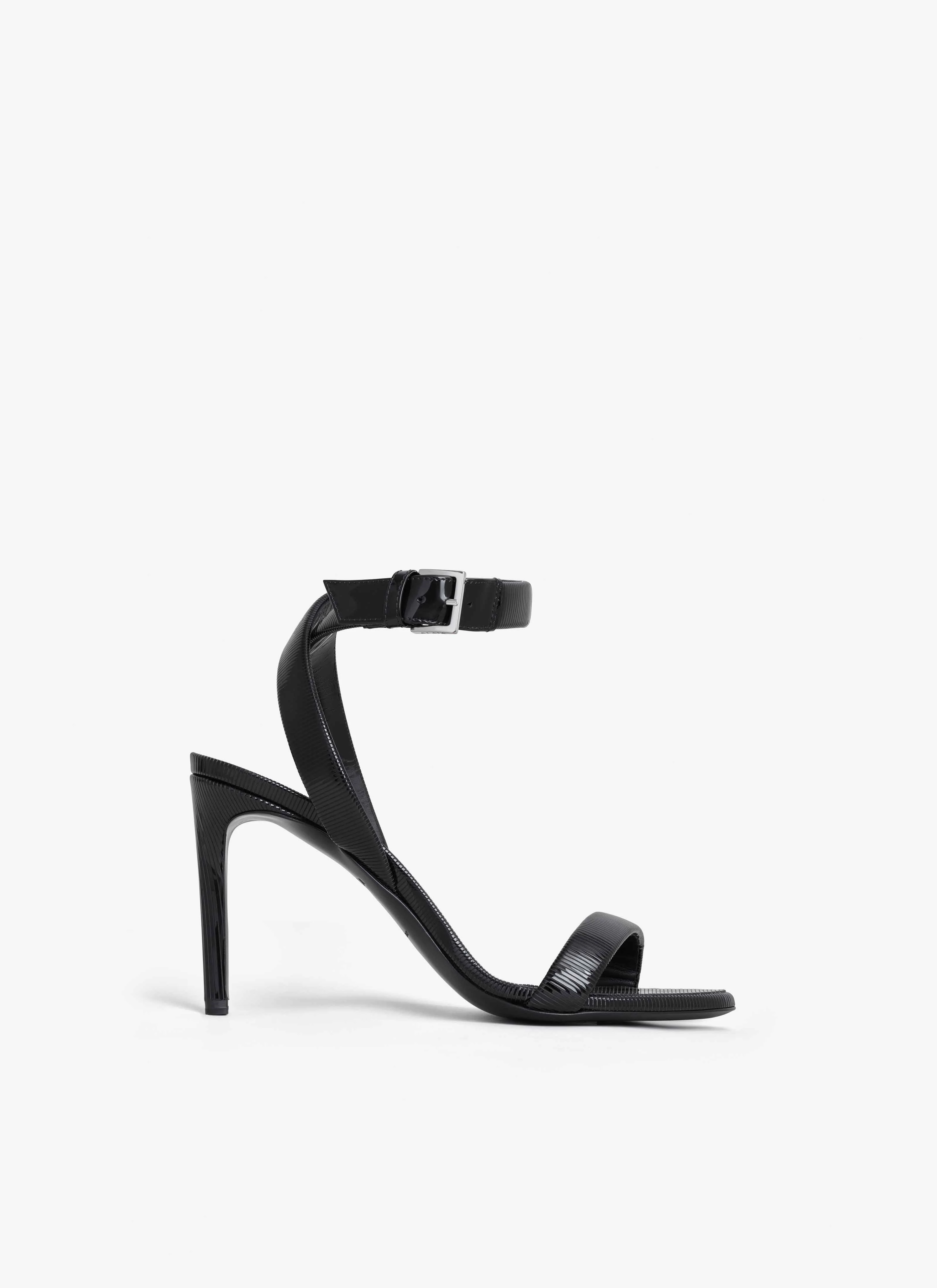 Stiletto sandals with an adjustable ankle strap Covered heel and insole Patent fine laser-ribbed calfskin leather creating a trompe l'œil chain effect 90mm heel Made in Italy DETAILS MAIN LINING:100%LAMBSKIN SOLE:80% CALFSKIN LEATHER 20% RUBBER UPPER MATERIAL 1:100% CALFSKIN LEATHER PRODUCT REFERENCE : AA3S135CK322 - 999