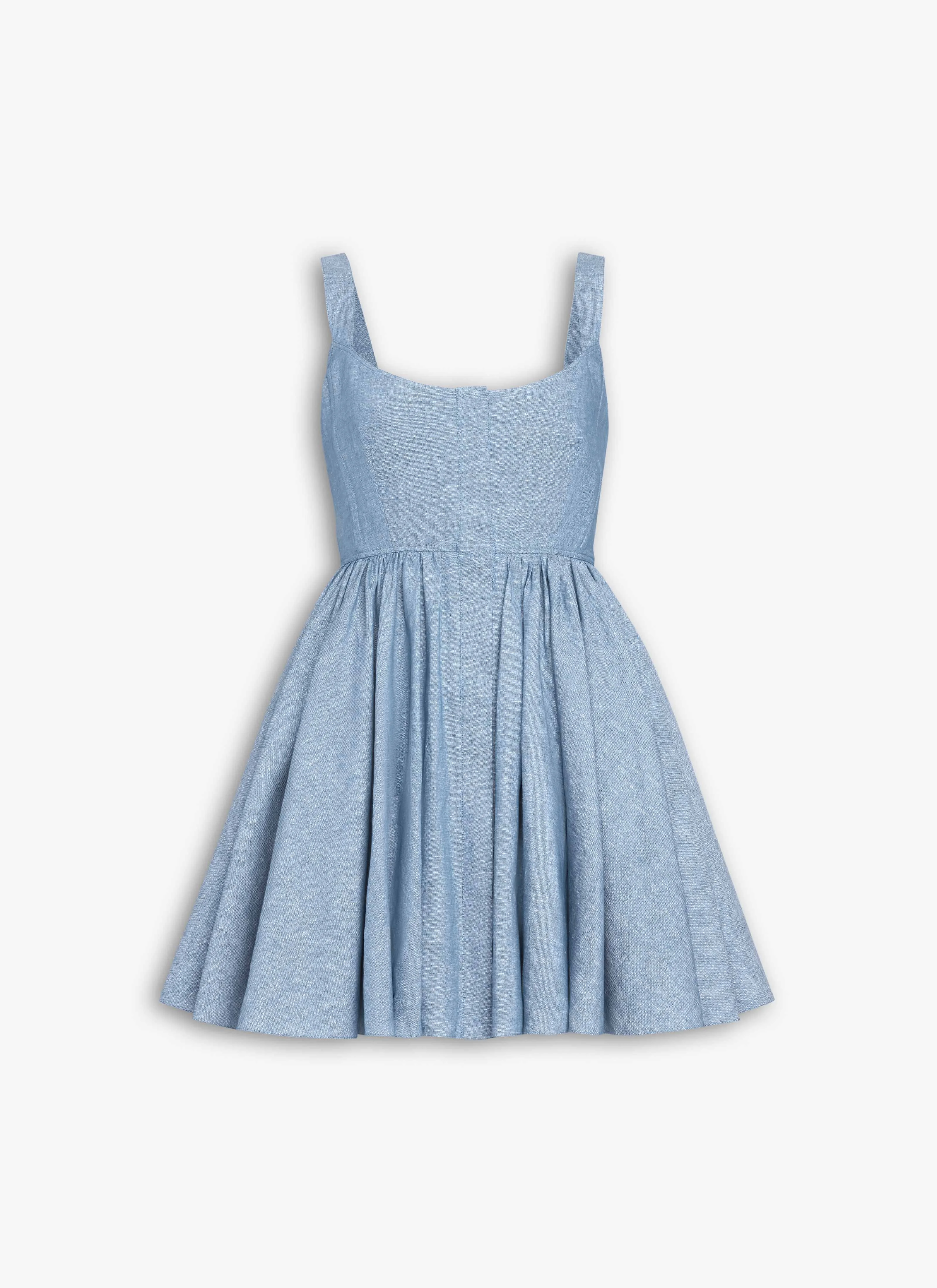 Skater sleeveless dress in cotton chambray Corseted bodice, scoop neck, flared volumous skirt, mini length Textured feel Made in Italy DETAILS MAIN MATERIAL : 55% COTTON 45% LINEN PRODUCT REFERENCE : AA9R1322W068B - 507