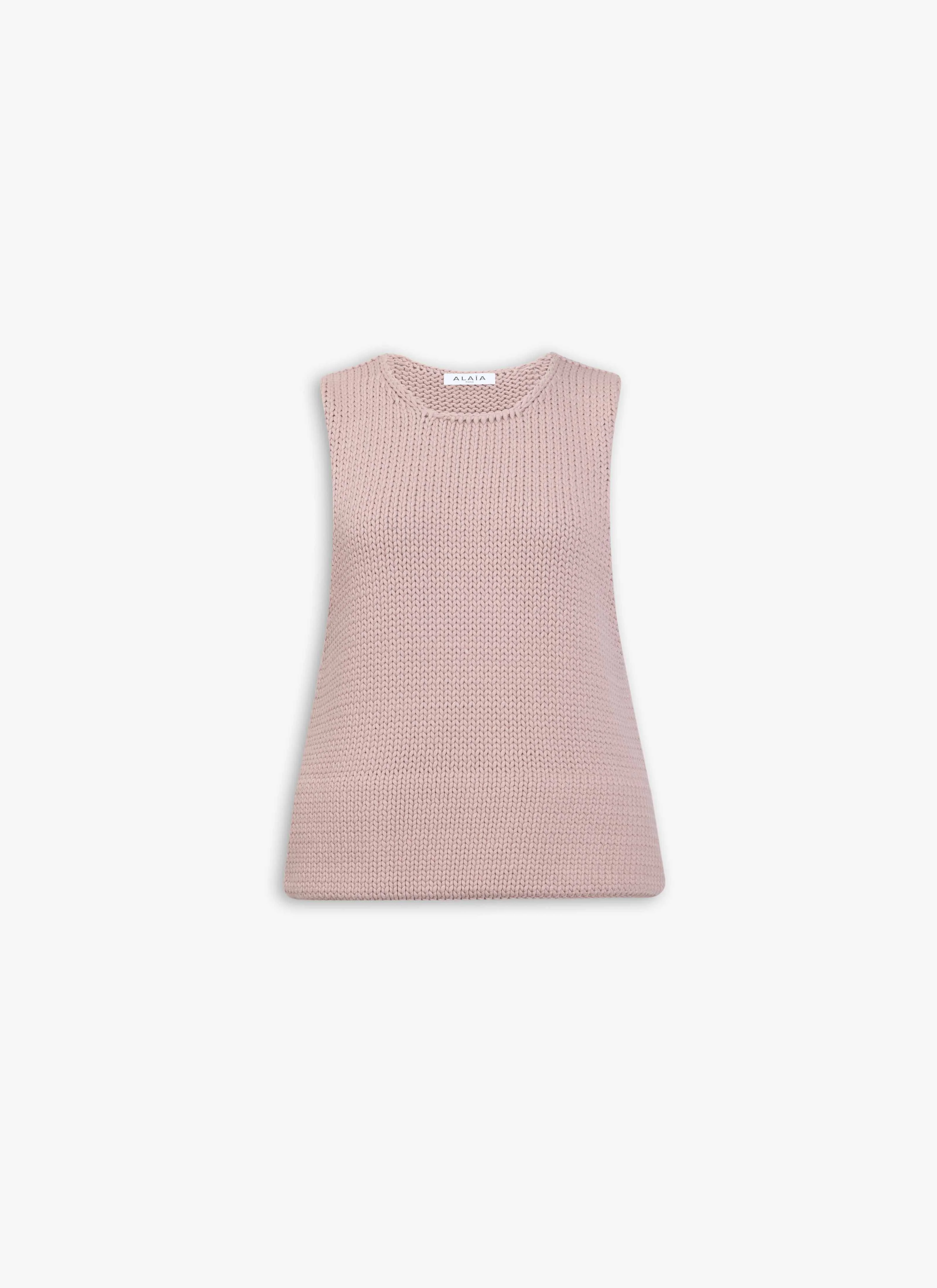 Chunky sleeveless sweater knitted from a technical cotton-covered yarn Crew collar, 3D folded hem Sculpted silhouette Made in Italy DETAILS MAIN MATERIAL : 76% COTTON 24% POLYAMIDE PRODUCT REFERENCE : AA9H1256K087B - 124