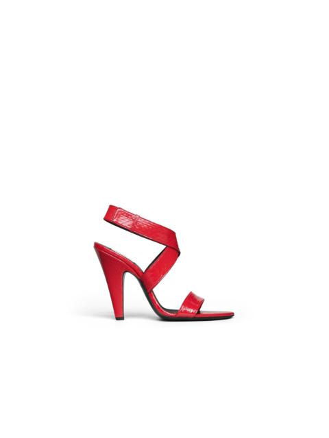 DETAILS Heeled sandals with cone shaped heel 110 mm heel Crisscrossed ankle strap Hidden buckle closure on the side Mirror fabric Leather sole Made in Italy MATERIALS MAIN MATERIAL: 100% CALF LEATHER MAIN LINING: 100% LAMB LEATHER OUTER SOLE: 50% CALF LEATHER, 50% RUBBER PRODUCT REFERENCE: AA3S2017I137-A51
