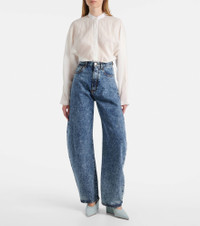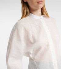 This Alaia blouse is made in Italy from a cotton and linen blend, exuding the brand's Parisian aesthetic and romantic flair. This piece features long sleeves, a fitted silhouette and a concealed button placket. Product Details - Material: 76% cotton, 24% linen - Care instructions: specialist clean - Made in Italy - Designer color name: Blanc - Item color: white - Contains non-textile parts of animal origin - Collar: band - Closure: concealed button placket - Sleeves: raglan - Hem: rounded - Item number: P01047519 Size & Fit - True to size - Semi-sheer - Cinched waist - Non-stretchy fabric - Falls below the hip - The model seen in the picture is 178cm-5'10" and wearing a size FR 36
