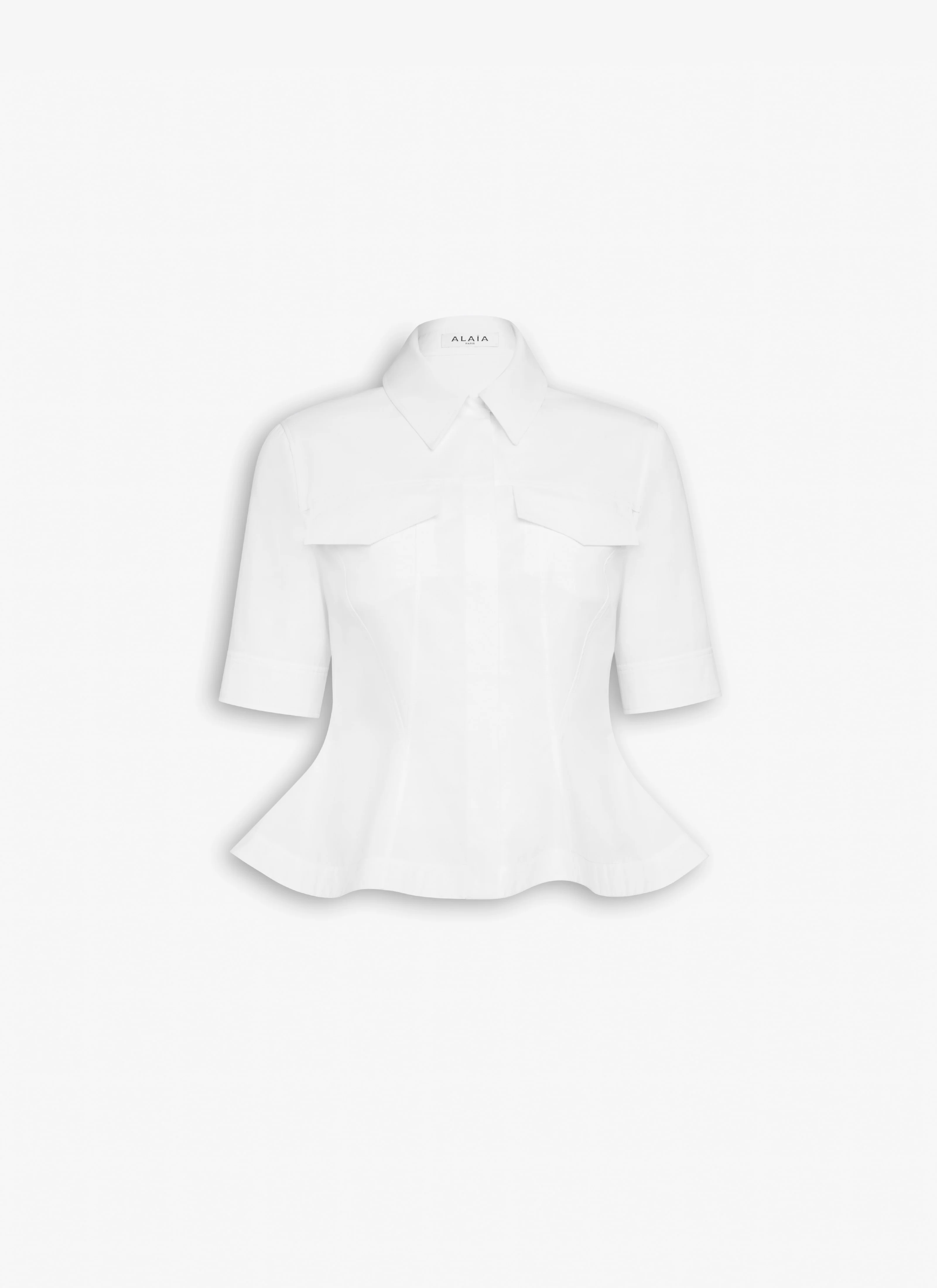 Peplum shirt in compact cotton poplin Short sleeves, pointed collar, square flap chest pockets Sculpted waistline, flare peplum hem Tailored fit Made in Italy DETAILS MAIN MATERIAL : 100% COTTON PRODUCT REFERENCE : AA9C0989T611B - 000
