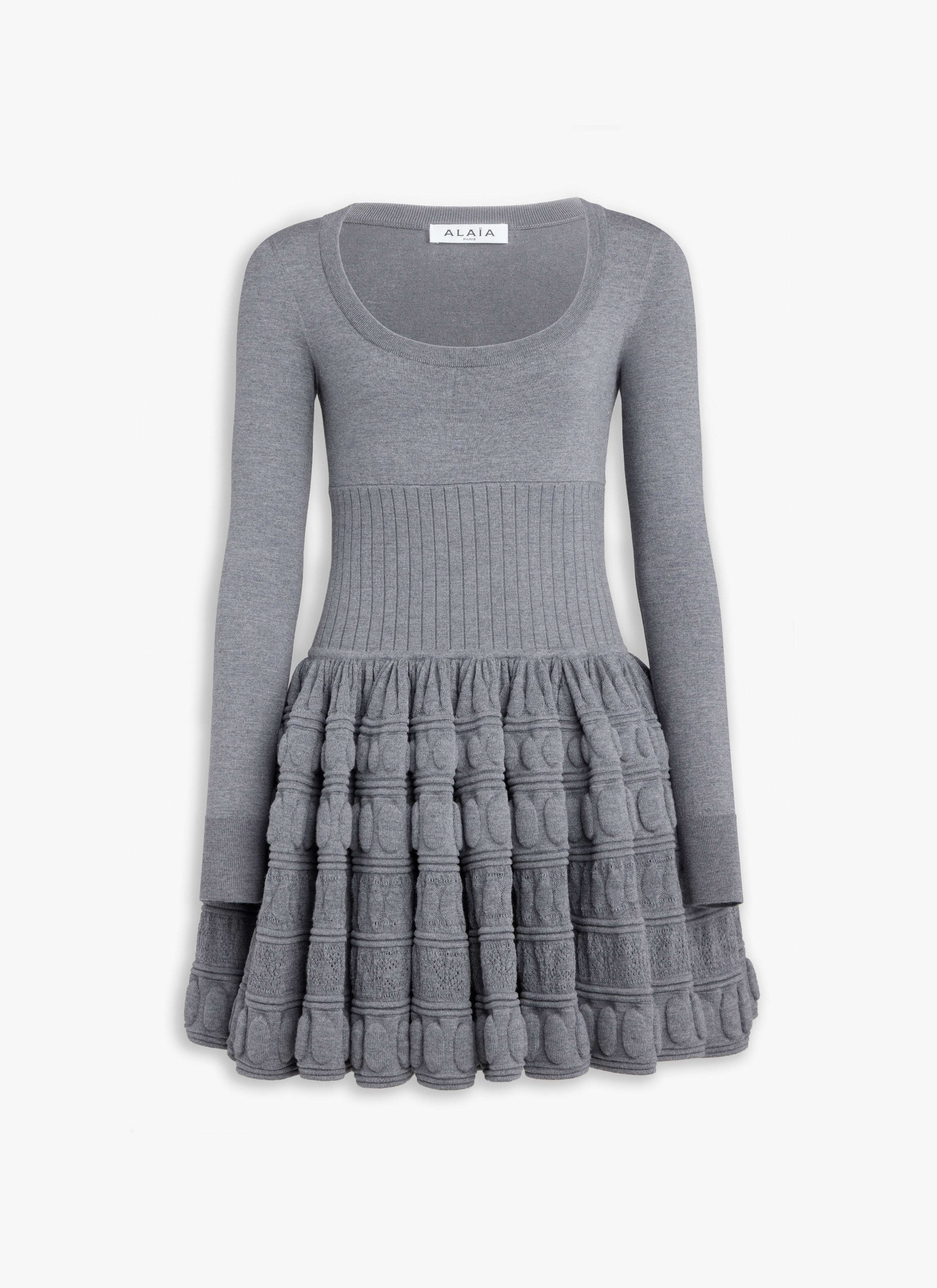 crinoline skater dress long sleeves, scoop neck volume exploding from the waist created by exclusive alaïa technique mimicking the effect of a traditional crinoline ribbon 3d details knitted in a soft wool made in italy DETAILS COMPOSITION: 81% WOOL, 12% POLYPROPYLENE, 7% POLYAMIDE THE MODEL IS 1M77 TALL AND WEARS A SIZE 36 PRODUCT REFERENCE: AA9R23945M839 - 821