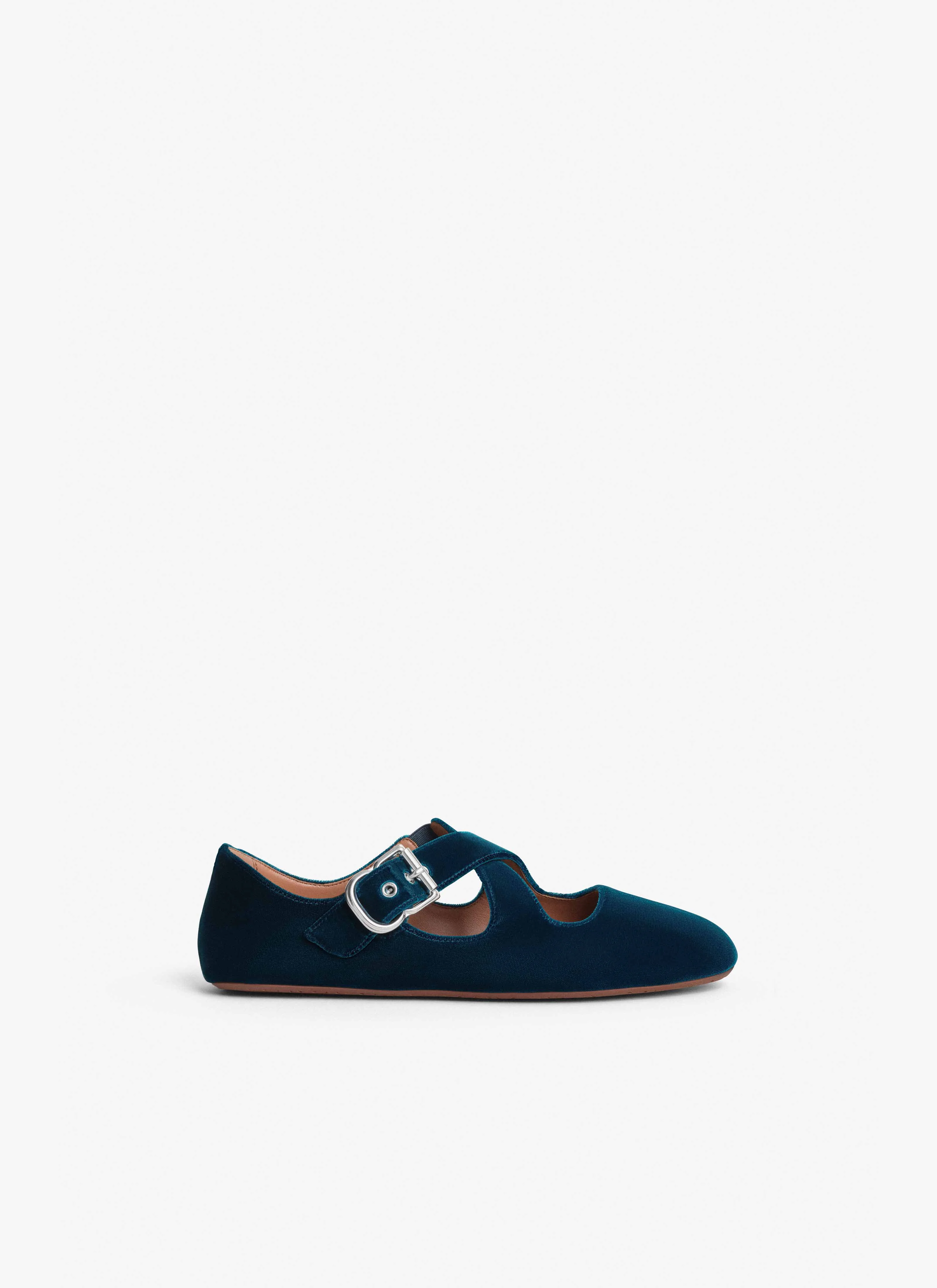Signature Alaia criss cross ballet flats inspired by classical Japanese shoes Cross buckle straps on top, round toes, rubber sole Velvet fabric Made in Italy DETAILS MAIN MATERIAL : 65% VISCOSE 35% CUPRO MAIN LINING : 95% LAMBSKIN LEATHER SECONDARY MATERIAL : 5% GOATSKIN LEATHER SOLE : 100% RUBBER BUCKLE : 100% ZAMAK PRODUCT REFERENCE : AA3A046A014-683