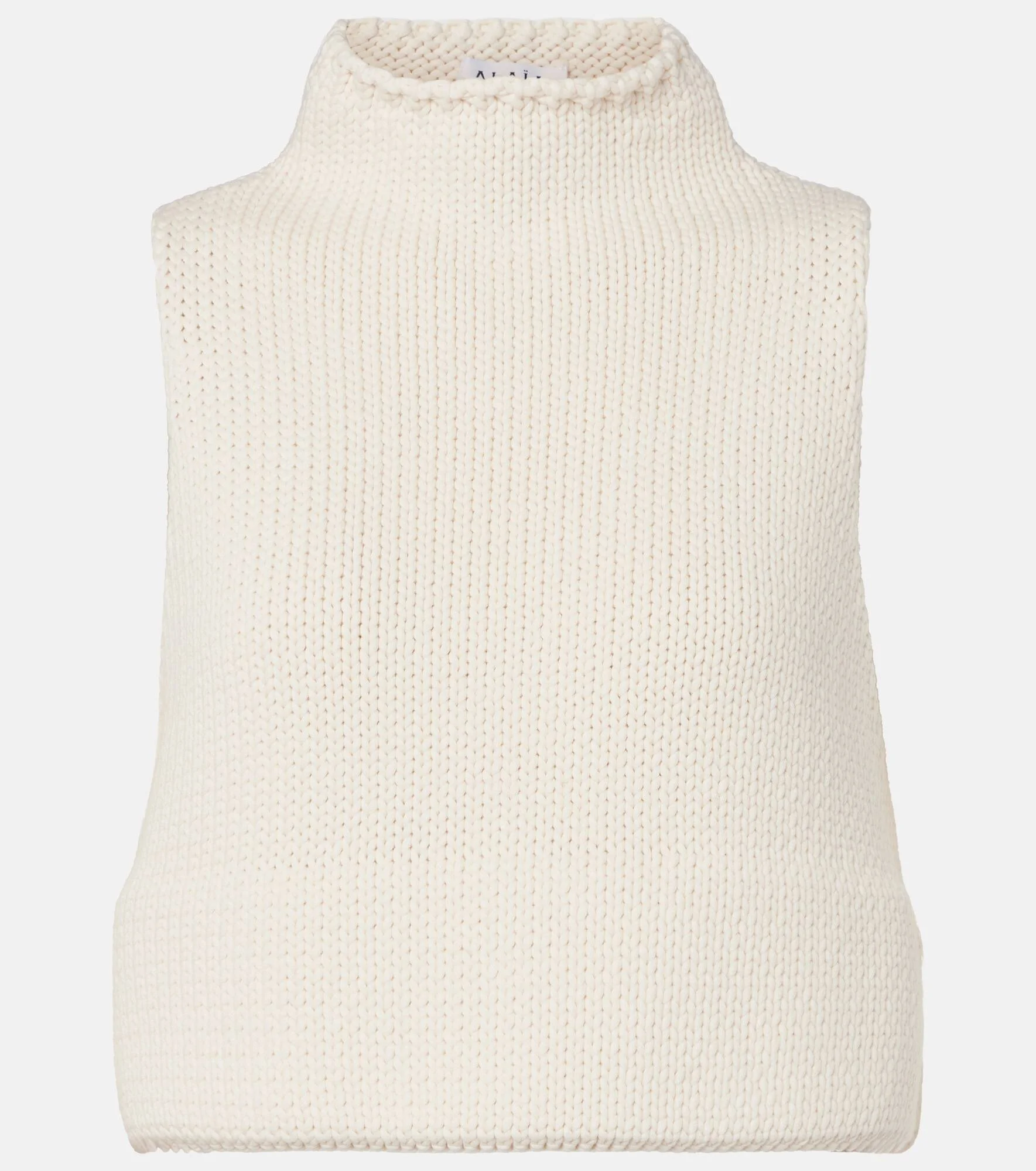 Crafted from a cotton-blend, this Alaia top is an essential wardrobe staple, perfect for casual everyday wear or refined looks. This sleeveless style features a high neck, a distinctive folded hem, and a chic cropped shape. Product Details - Material: 76% cotton, 24% polyamide - Care instructions: dry clean - Made in Italy - Designer color name: Blanc Naturel - Item color: white - Length: cropped - Collar: mockneck - Item number: P01047445 Size & Fit - True to size - Designed for a loose fit - Thick material - Non-stretchy fabric - Cropped - The model seen in the picture is 178cm-5'10", cup size %cupsize%, and wearing a size FR 36