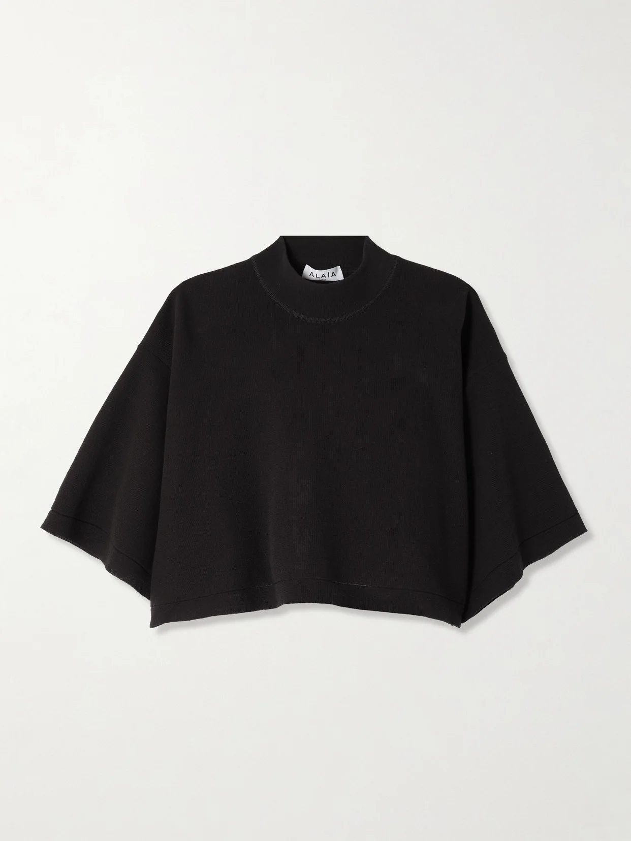 Simple but striking, Alaia's T-shirt melts over your frame like a cape. It's made from cotton-jersey with a raised neckline, and loose, drop-shoulder sleeves that create its illusion - the way they graze the cropped waist is satisfyingly aesthetic. Wear it with all-black outfits.
