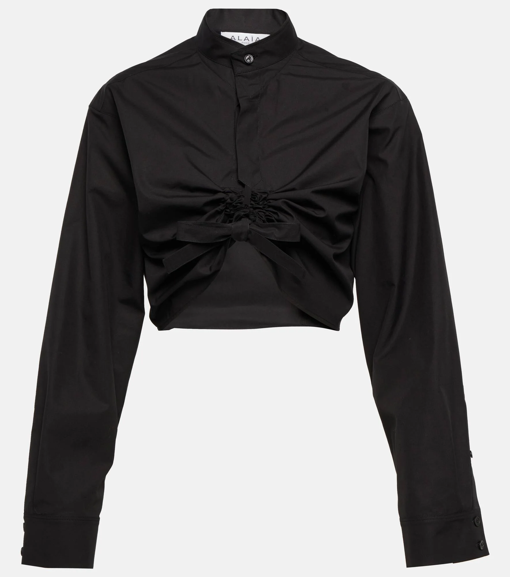 This cropped shirt from Alaïa is equal parts sophisticated and alluring. Crafted from pure cotton, the long-sleeved style has a stand collar and a drawstring tie detail at the hem. Product Details - Made in Italy - Closure: buttoned front - Care instructions: dry clean - Designer color name: Noir Alaia - Material: 100% cotton - Item number: P00746547 Size & Fit - True to size - Dropped shoulders - Cinched waist - Mid-weight material - Slightly cropped - The model seen in the picture is 178cm-5'10" and wearing a size FR 36