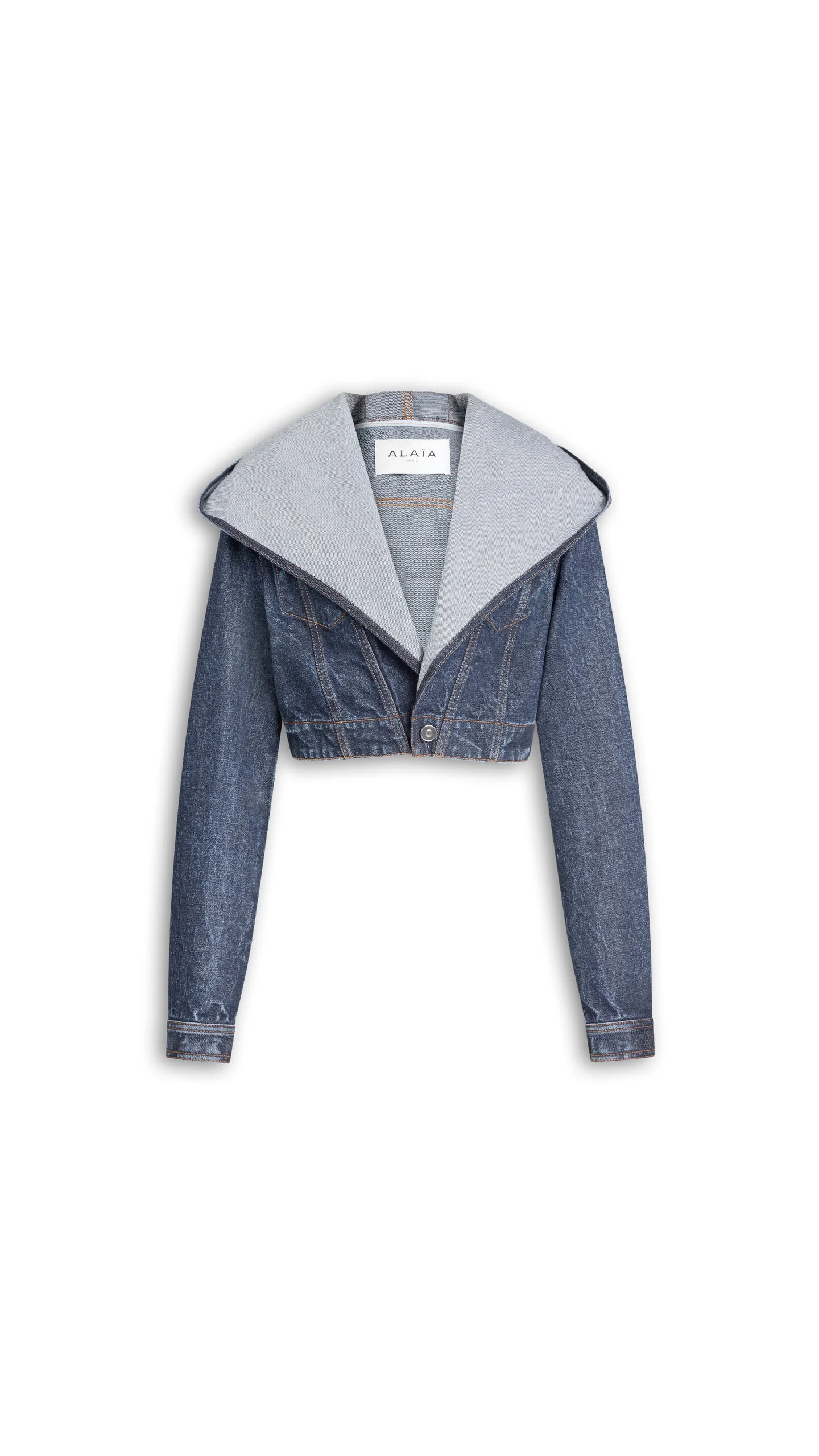 DETAILS Cropped hooded jacket in dock blue denim Cropped fit, dropped shoulders Integrated hood, silver hardware buttons and internal pocket Straight hem, not lined Made in Italy MATERIALS Highlights MAIN MATERIAL: 99% COTTON, 1% POLYURETHANE PRODUCT REFERENCE: AA9V0306D014C-A24