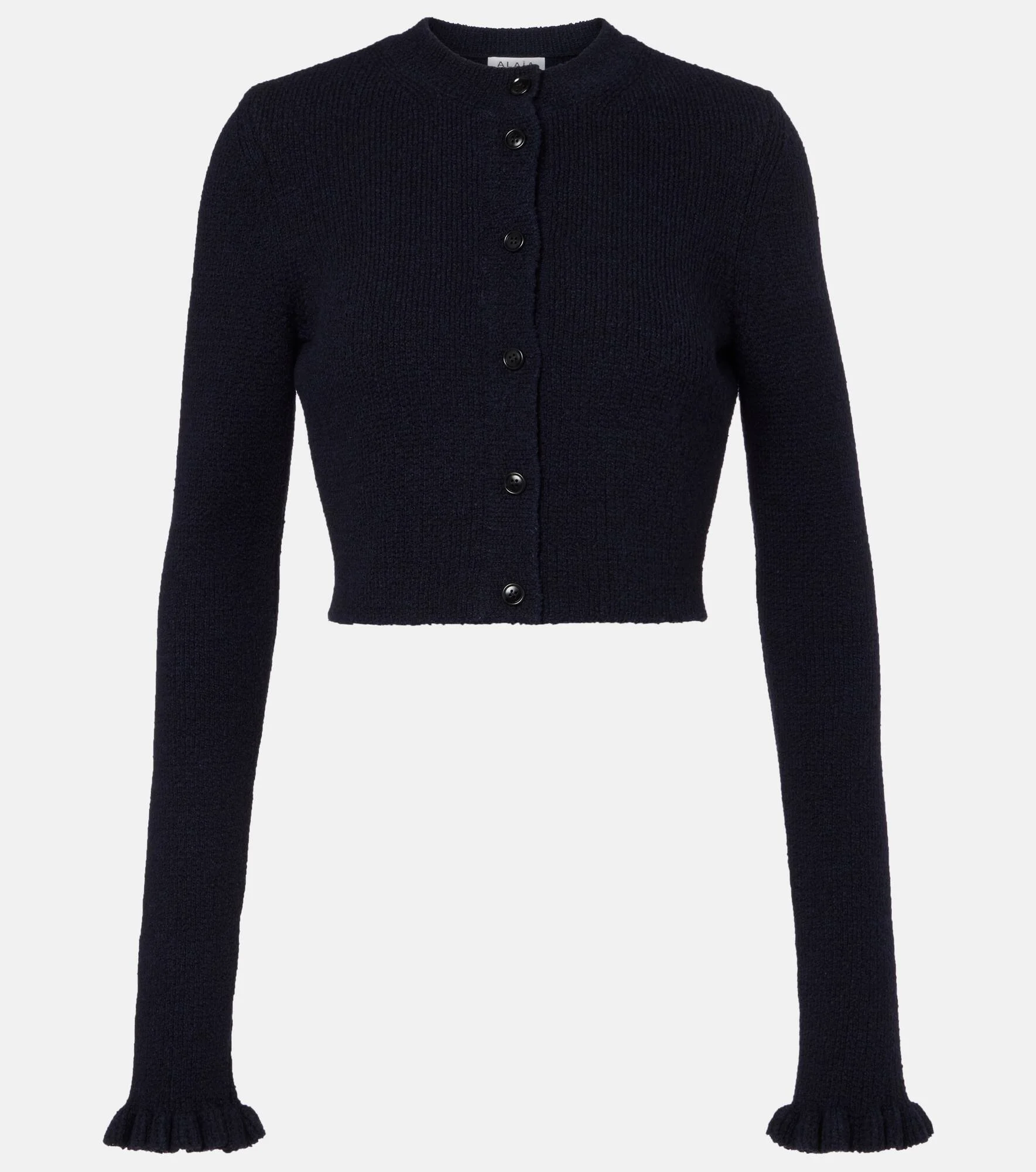 Honoring Azzedine Alaia’s legacy, the maison’s sculptural yet wearable collections hold an artful balance that only the most skilled designers can achieve. This cardigan is cut from soft wool and silk-blend material into a cropped silhouette with ruffled cuffs. Product Details - Material: 48% wool, 43% silk, 9% polyamide - Care instructions: specialist clean - Made in Italy - Designer color name: Marine - Item color: blue - Details: 43% silk, 39% wool, 17% polyamide, 1% elastane - Closure: buttoned front - Cuff: ruffled - Item number: P01085069 Size & Fit - True to size - Fitted - Slightly stretchy fabric - Cropped - The model seen in the picture is 178cm-5'10" and wearing a size FR 36