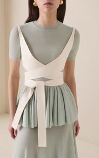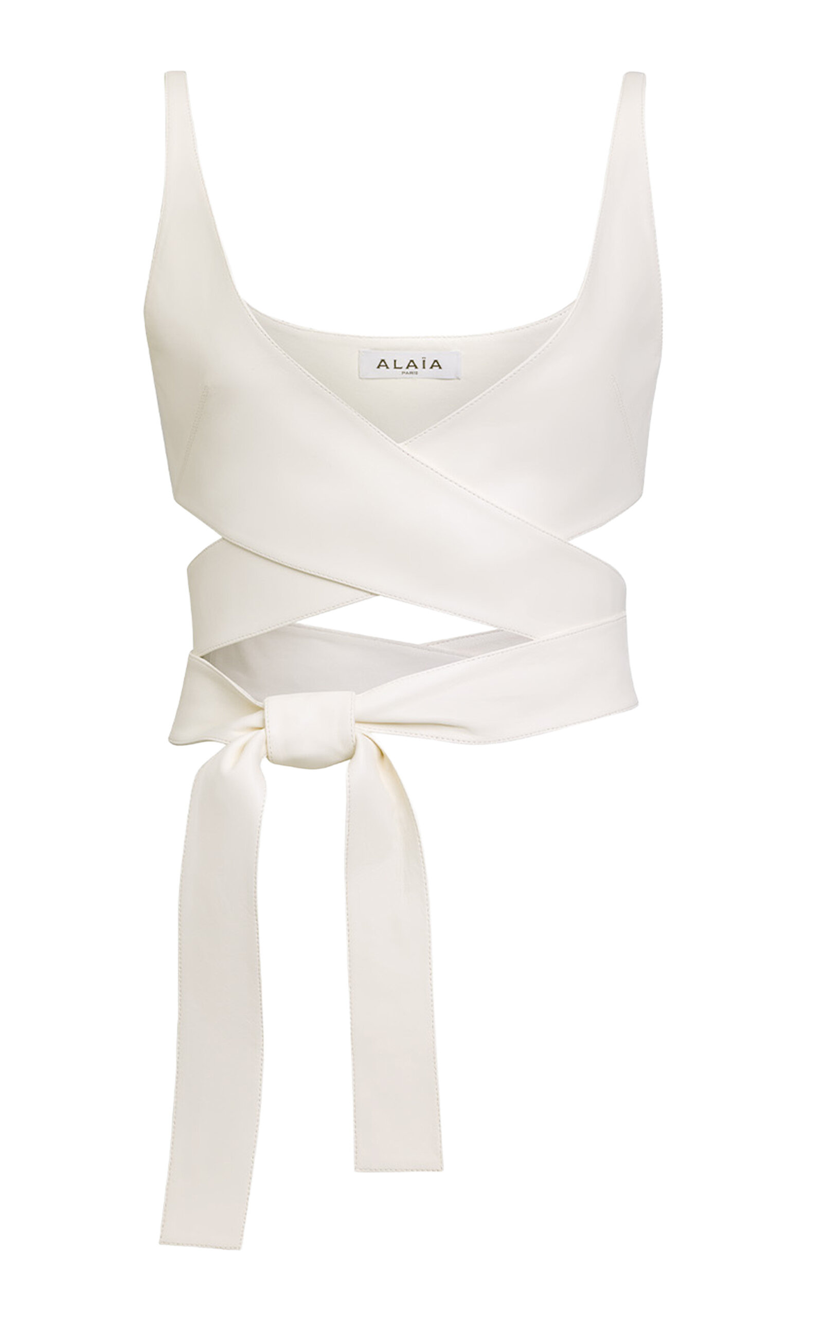 Founded by Azzedine Alaia, today the maison, under the direction of Pieter Mulier, continues the revered couturier's uncompromising vision which champions masterful cuts that accentuate the female form. This top is made from leather straps that wrap around the bust and waist. Style it on its own or layer it over a knit top to accentuate your curves. PRODUCT DETAILS - Pre-Fall '25 - Zip fastening - Composition: 100% lambskin leather - Designer color: Pearl White - Dry clean - Made in France SIZE & FIT - Our model is wearing a size FR 34 - Model is 5'10" with a 31" bust, 23.5" waist, and 33.5" hip - Designed for a slim fit
