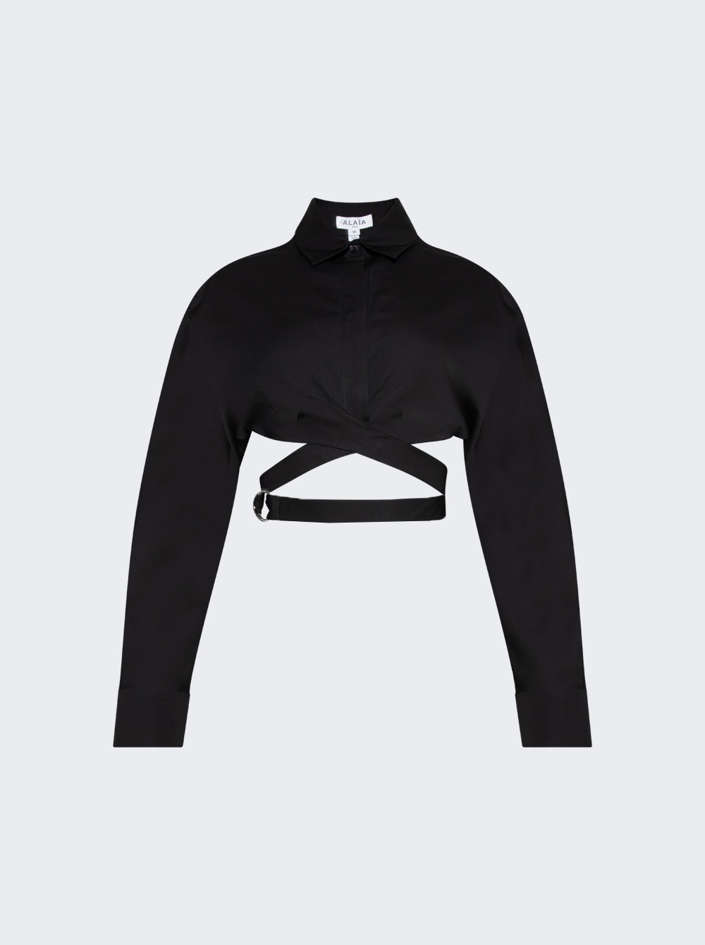Details - Regular fit - Classic collar - Wrap design - Long sleeves - Buttoned cuffs - Silver tone hardware - Buckle fastening - Tied waist - Care according to label - Material: 100% Cotton - Model is 5'9"/175cm and is wearing a size FR36 Brand Style: AA9C09056T611 Designer/Brand: ALAIA