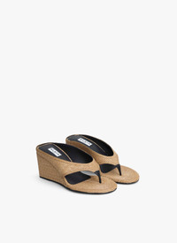 Wedge thong mules Distinctive cubic heels CUT FROM PAPER STRAW PANNELS THAT ARE ARTISANALLY WEAVED AND ASSEMBLED TOGETHER Calfskin leather lining 75 mm heel Made in Italy DETAILS MAIN LINING:100%LAMBSKIN SOLE:80% CALFSKIN LEATHER 20% RUBBER UPPER MATERIAL 1:85% PAPER 15% POLYESTER PRODUCT REFERENCE : AA3M105TK054 - 113