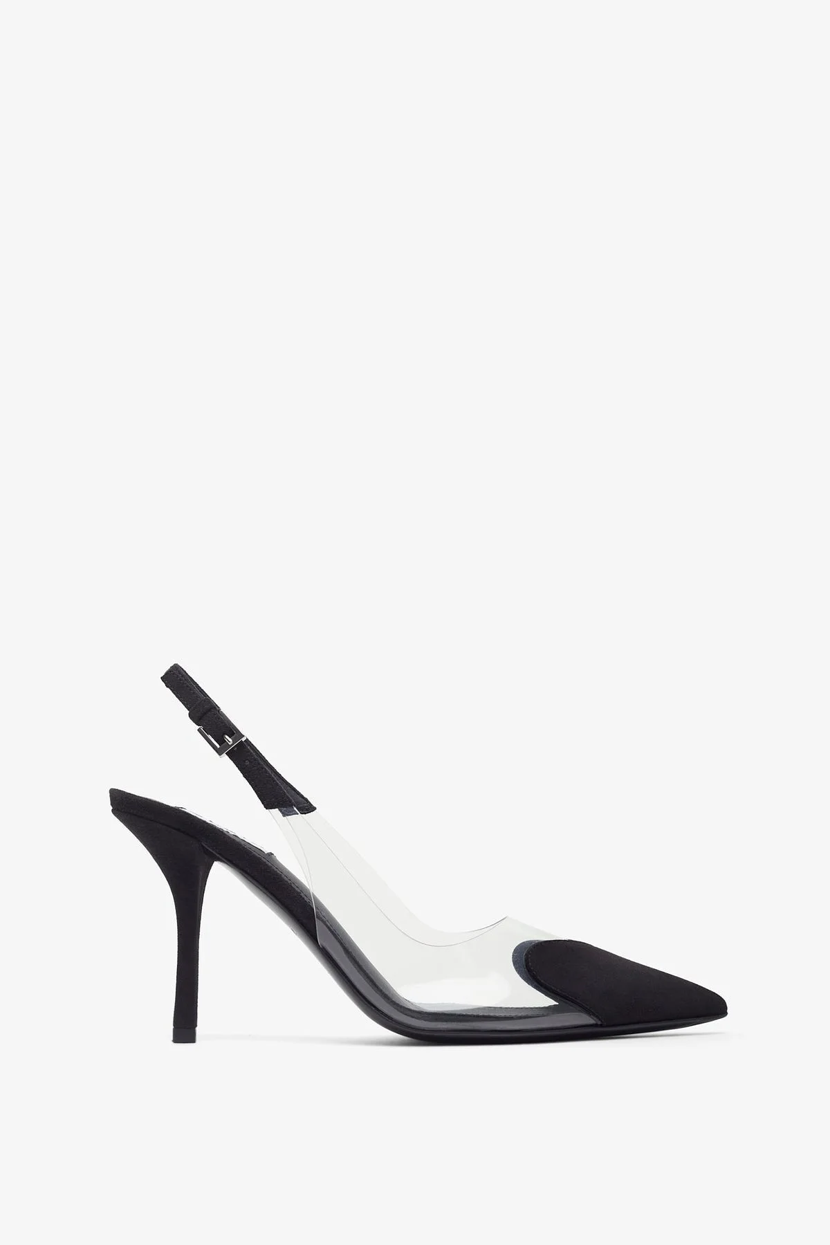 Black suede and pvc slingback pumps from Alaia. The Coeur slingback pumps are made of clear pvc and suede, feature a flattering heart front cut along with a sharply pointed toe. It is set on a new shaped slim stiletto heel measuring 90mm. - Leather sole - True to size - Made in Italy Product Code: AA3E083CK318999