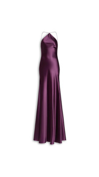 DETAILS Slip dress in satin Maxi length, halter neck, sleeveless, criss cross back with draped fabric, column silhouette Slim fit cinched at the waist Invisible side zip closure, bias-cut, unlined Made in Italy MATERIALS Highlights MAIN MATERIAL: 100% SILK PRODUCT REFERENCE: AA9R2804W125C-713