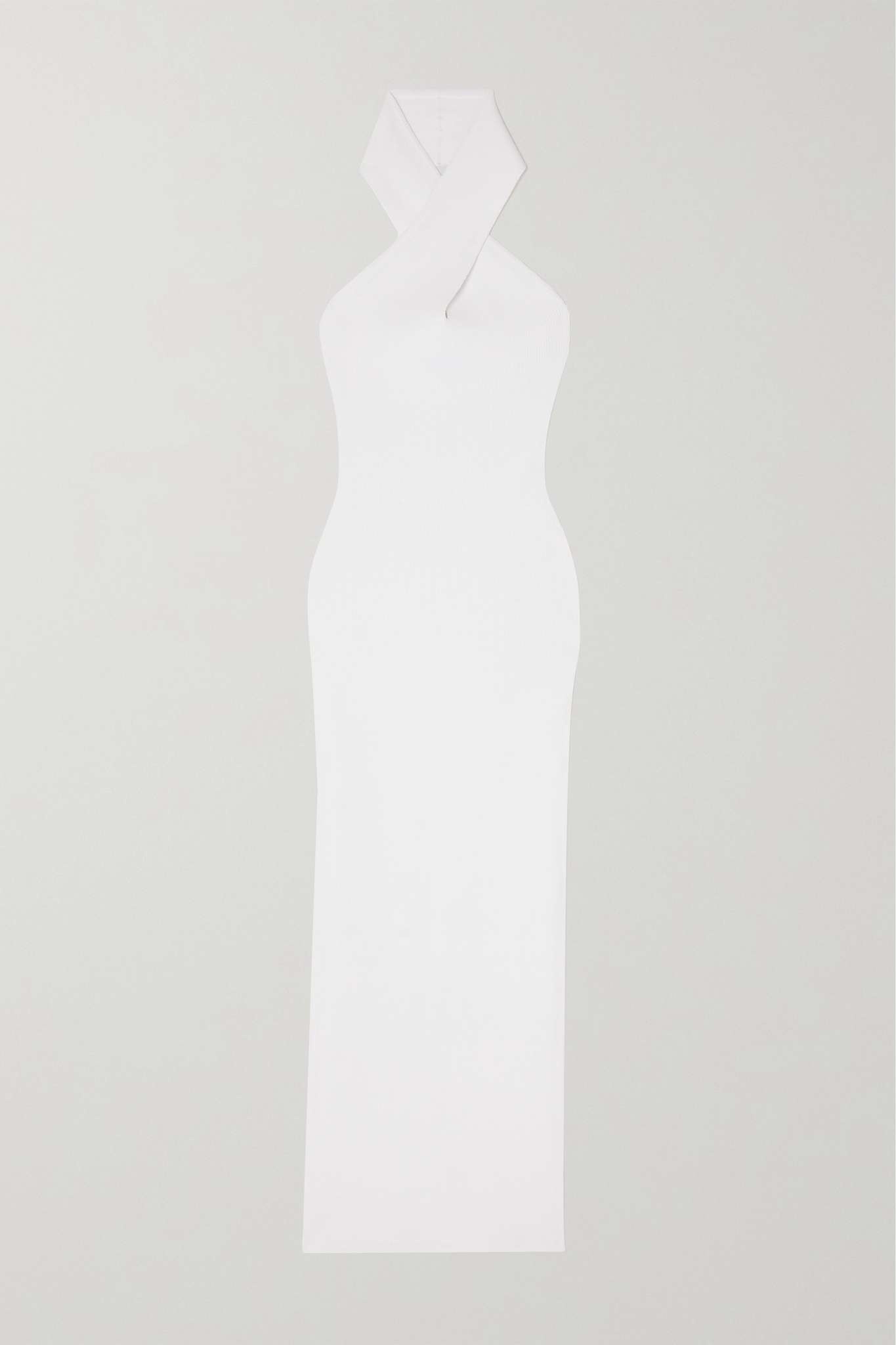 EDITORS'NOTES Alaïa's dress is simple, and strikingly so. Made from the Maison's sculpting ribbed-knit, it swerves elegantly through a criss-crossing halterneck and hugs your frame down to the ankles. SIZE & FIT - Fits true to size, take your normal size - Designed for a close fit - Mid-weight knit - Model is 177cm/ 5'10" and is wearing a FR 36 DETAILS & CARE - White ribbed-knit - Slips on - 75% viscose, 25% polyester