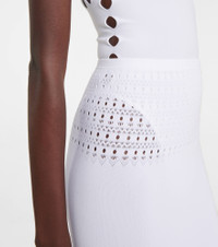 This figure-hugging midi skirt from Alaïa is made from technical swim fabric. The white design is accented with Vienne cutouts that enhance the waist and it can also be worn as a strapless dress or draped skirt. Product Details - Made in Italy - Material: 82% polyester, 18% elastane - Care instructions: hand wash - Designer color name: Blanc Optique - Item number: P00634531 Size & Fit - Fits small to size - we recommend trying one size larger - Fitted - Lightweight material - High-waisted - The model seen in the picture is 178cm-5'10" and wearing a size FR 38
