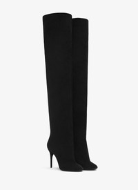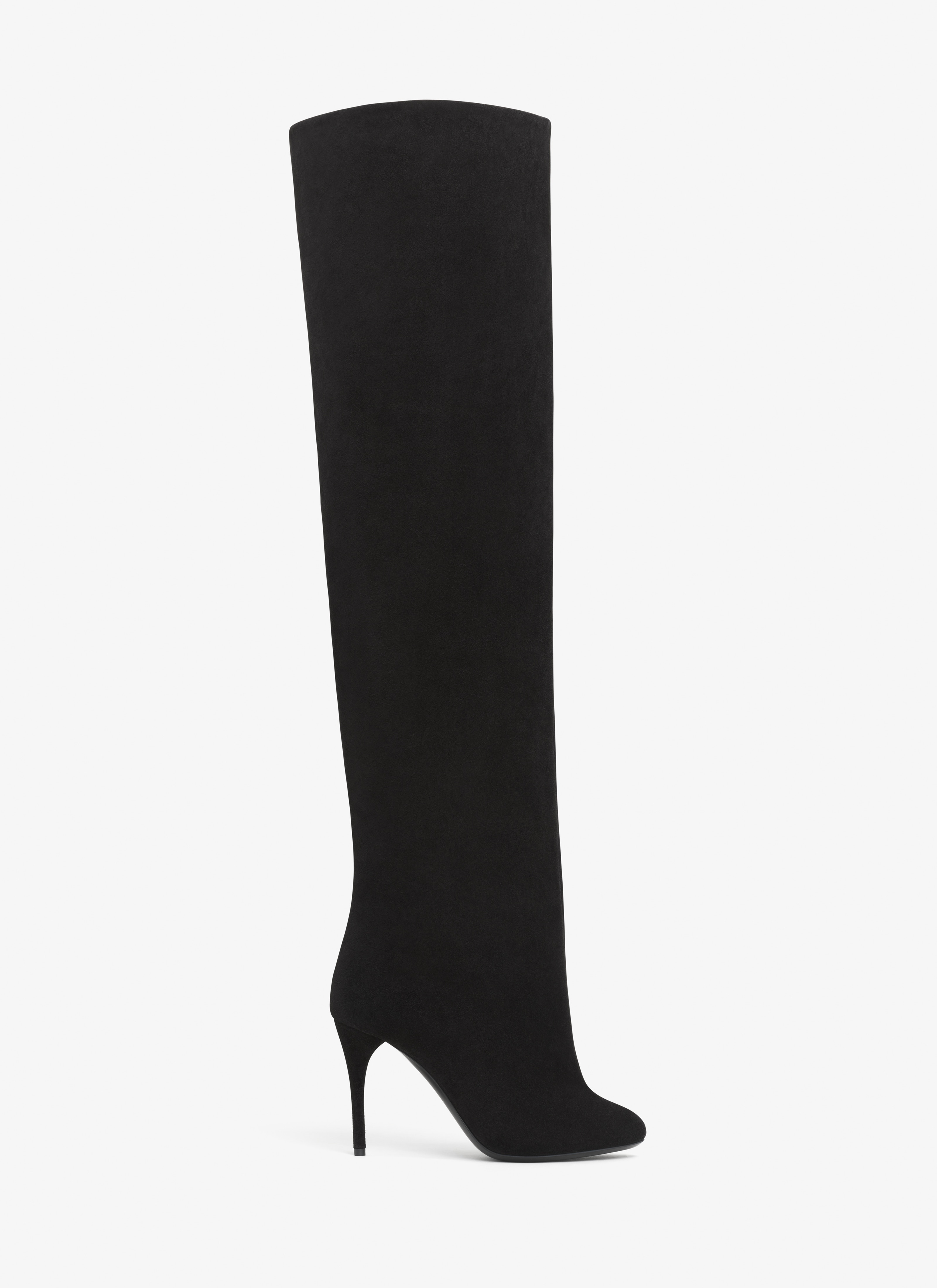 Thigh-high boots with a wide and straight shaft for a feminine line 90mm heel, knee-high length, round toes Suede calfskin leather Made in Italy DETAILS MAIN LINING: 100% LAMBSKIN SOLE: 80% CALF LEATHER 20% RUBBER UPPER MATERIAL 1: 100% CALF LEATHER PRODUCT REFERENCE: AA3O056CK177 - 999
