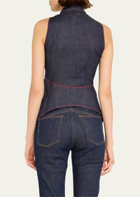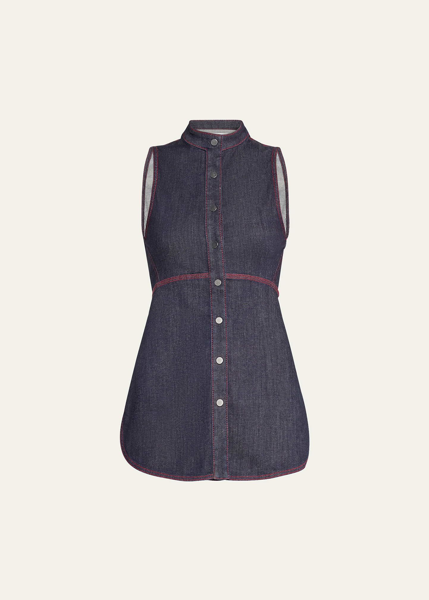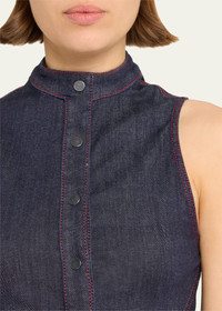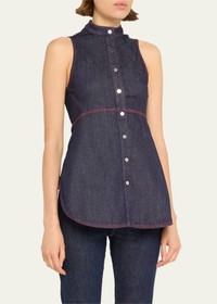 ALAIA denim blouse with contrast topstitching Stand-up collar; button front Sleeveless Fitted Flared hem Cotton/polyester/elastane Made in Italy Model is 5'10"/177cm. Online Inquiries: BGS21_B9CNR| Store Inquiries: #4838760