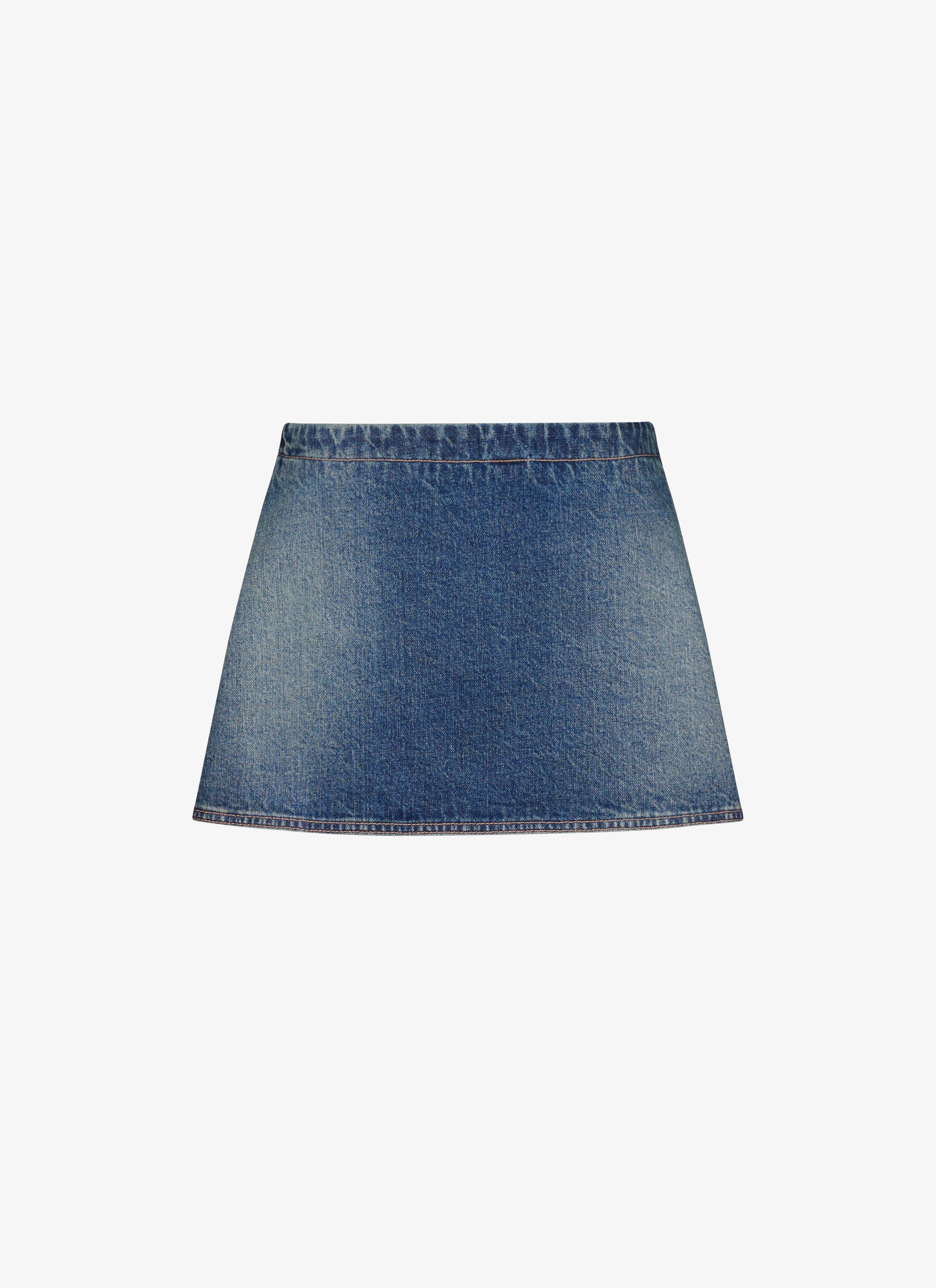 mini a line denim skirt no pockets invisible zipper features the iconic alaïa cross stitches at the back made from stone washed blue denim made in italy DETAILS COMPOSITION: 100% COTTON PIPING: 65% POLYESTER, 35% COTTON THE MODEL MEASURES 1m78 AND WEARS A SIZE 36 PRODUCT REFERENCE: AA9J04554T536 - 525
