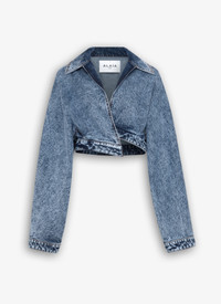 Cropped spiral jacket in stonewashed denim V-neck collar with notch lapel, long sleeves, classical denim and topsticthing details, asymmetrical hem Integrated spiral belt wraped around the waist Made in Italy DETAILS MAIN MATERIAL: 99% COTTON 1% POLYURETHANE UNDER BELT: 100% STEEL PRODUCT REFERENCE: AA9V1093T535A - 524