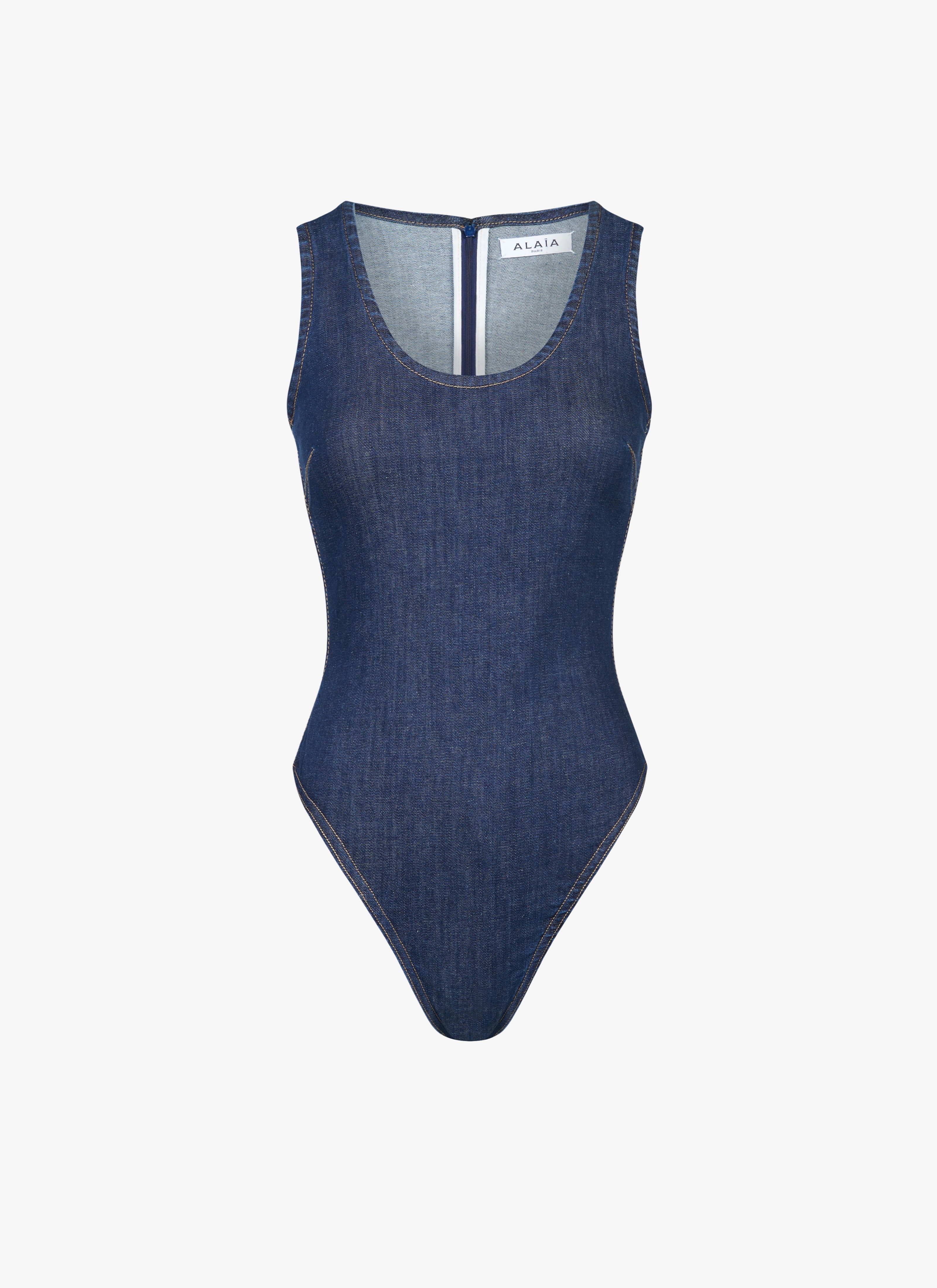 tank body low circular neckline slim fit made from stretch denim made in italy DETAILS COMPOSITION: 90% COTTON ADDITIONAL MATERIAL: 8% POLYESTER, 2% ELASTANE PIPING: 65% POLYESTER, 35% COTTON PRODUCT REFERENCE: AA9B00324T573 - 516