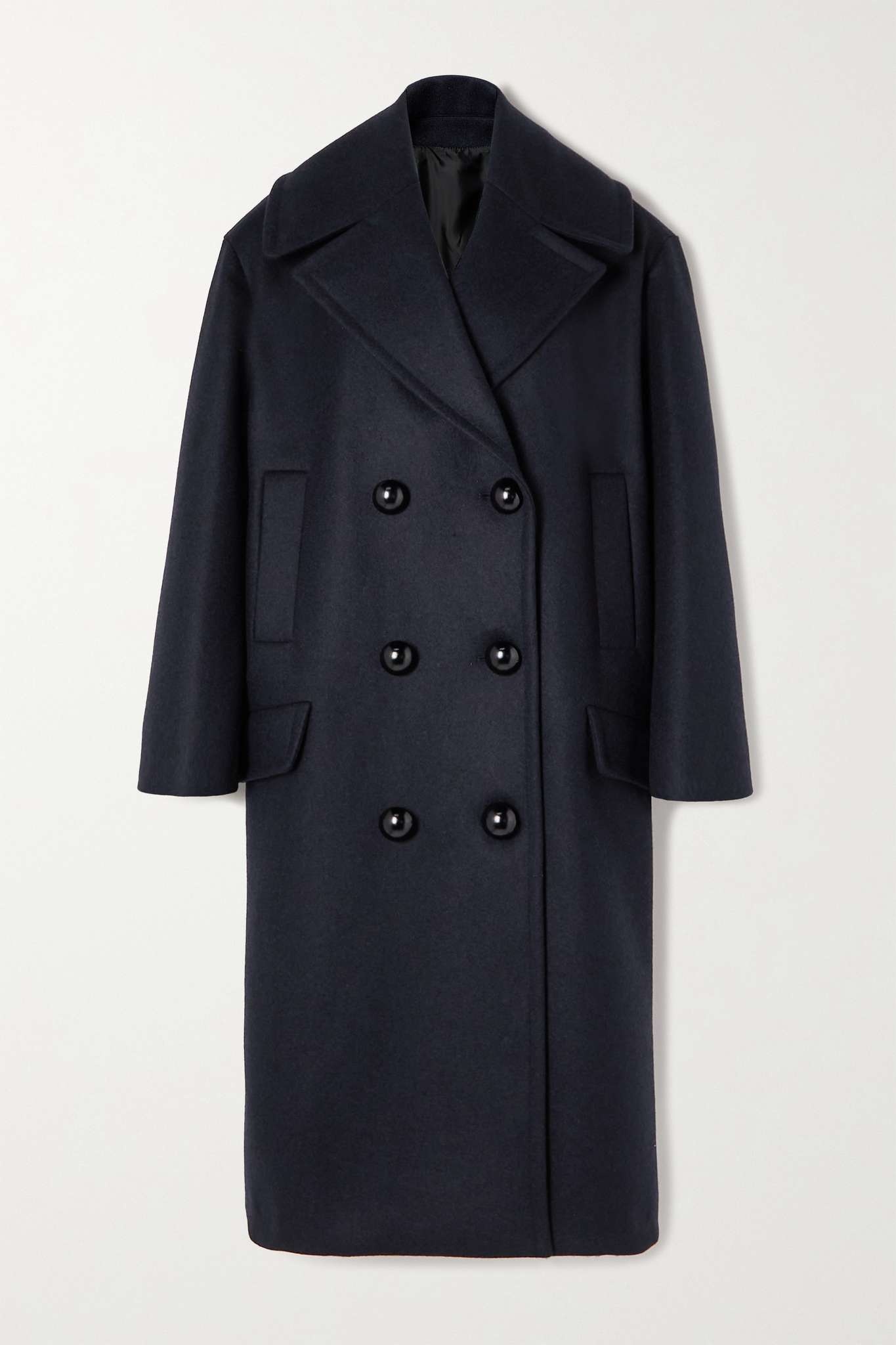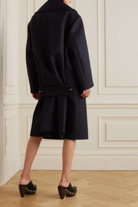 EDITORS'NOTES Styled with the collar half popped, Alaïa's coat brought the drama at the Fall '22 show. It's tailored in boxy proportions that err on sculptural thanks to how the thick wool holds its shape. SIZE & FIT - Fits large to size, take one size smaller than normal - Designed for a boxy fit, cut to be worn loose - Weighted, non-stretchy fabric - Model is 177cm/ 5'10" and is wearing a FR 34 DETAILS & CARE - Navy wool - Button fastenings through double-breasted front - 100% wool; lining: 100% cupro - Dry clean - Designer color: Marine Large to size. See Size & Fit notes.