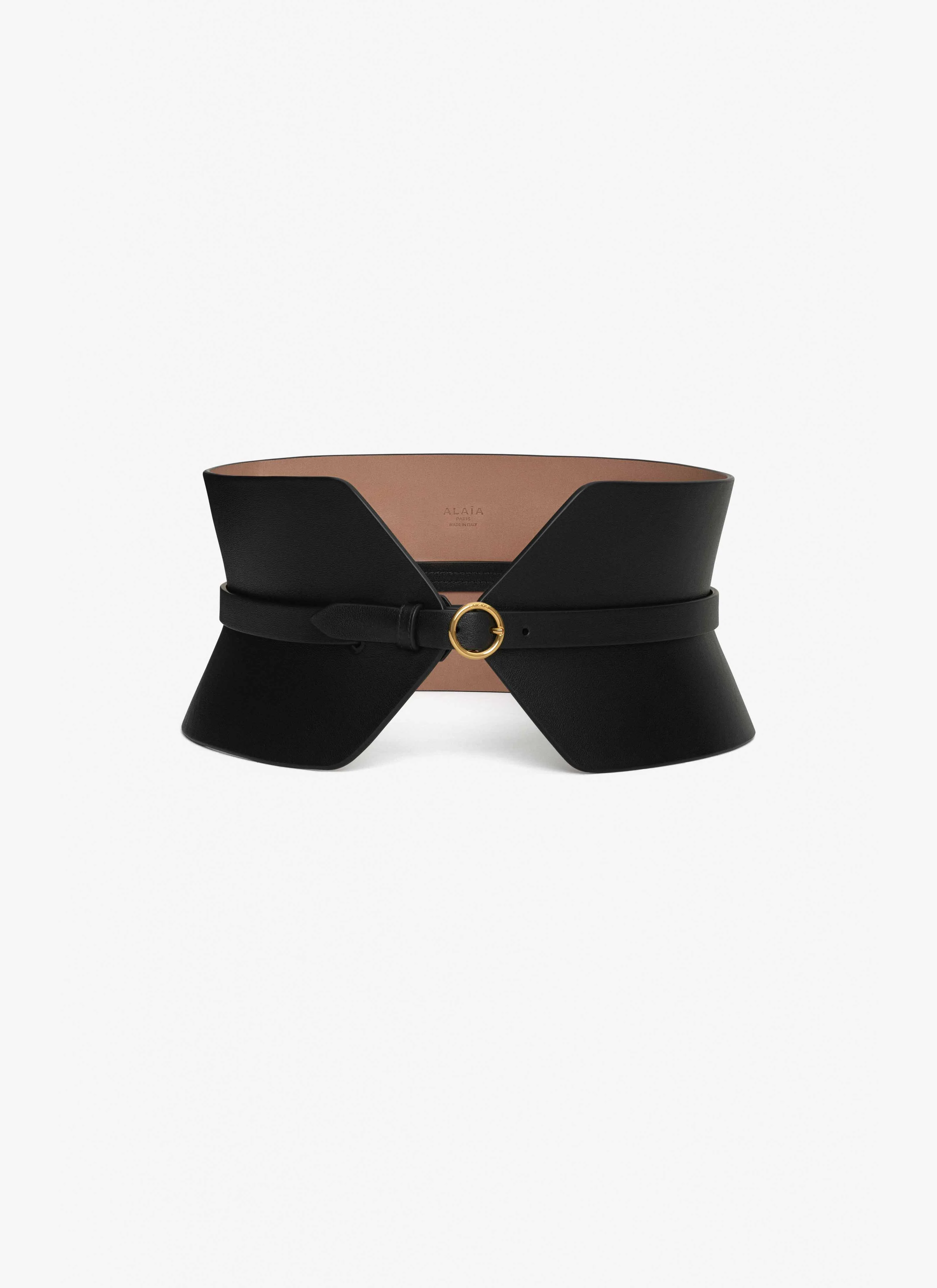 Sleek corset belt with a thin belt integrated A signature Alaia accessory shaped to enhance the waist Round metallic buckle Calfskin leather with a glossy finish Dimensions (cm) : H 12 Made in Italy DETAILS MAIN MATERIAL:100% CALFSKIN LEATHER MAIN LINING:100% CALFSKIN LEATHER PRODUCT REFERENCE : AA1C331GCA332 - 999