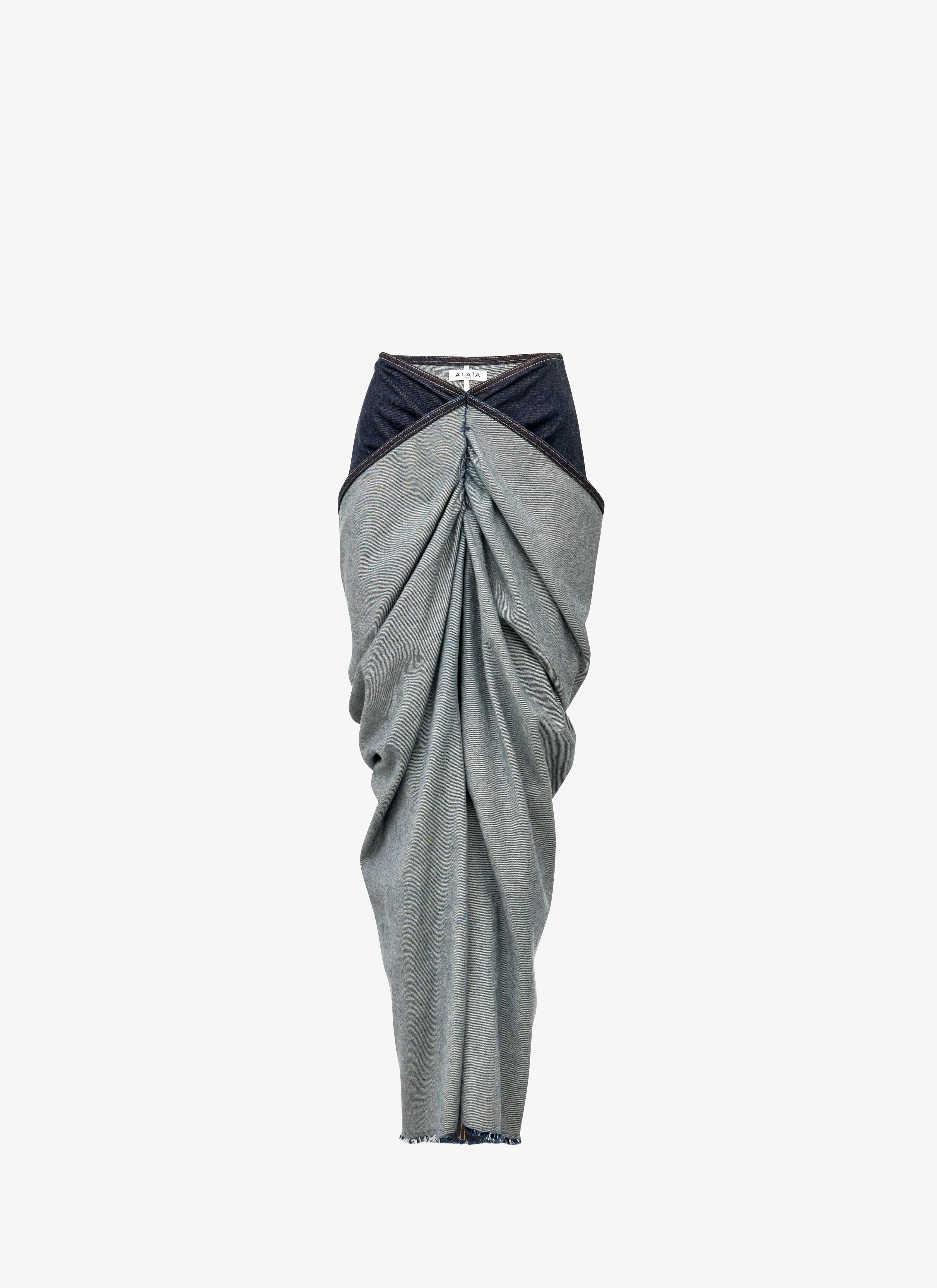 Maxi draped denim skirt, gathers at the center, forms a v-shape at the front, in and out contrasted denim. Made in Italy DETAILS COMPOSITION: 100% COTTON LINING: 65% POLYESTER, 35% COTTON PRODUCT REFERENCE: AA9J04153T537 - 516