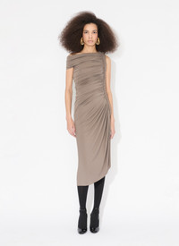 Draped dress in supple jersey Fitted, asymmetrical cut Circular detail in matching jersey, draped effect Made in Italy DETAILS COMPOSITION: 96% VISCOSE, 4% ELASTANE PRODUCT REFERENCE: AA9R1408J050A - 755