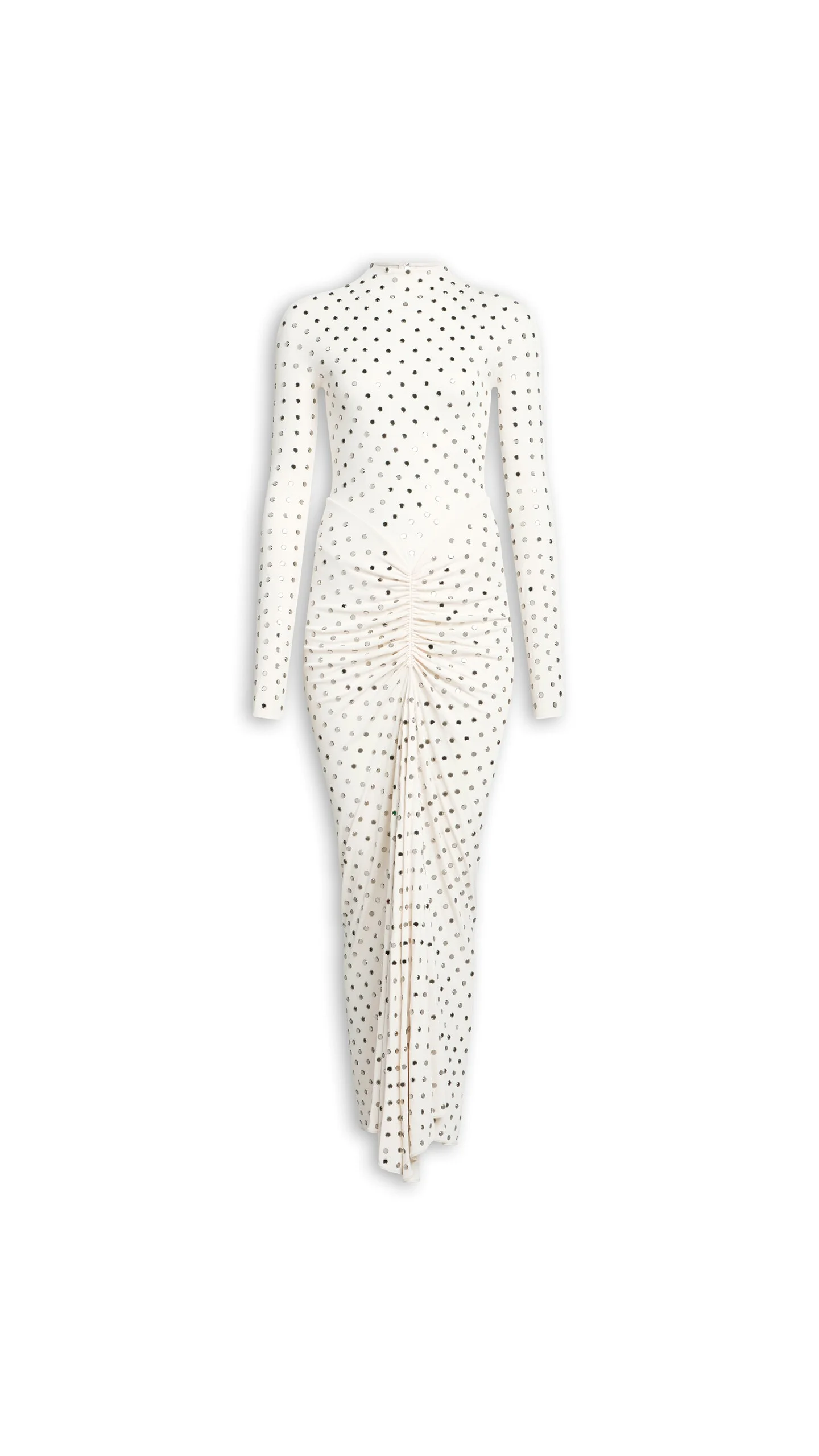 DETAILS Draped long sleeve dress in fluid strass jersey Maxi length, high neck, long sleeves, column silhouette Bodycon fit cinched at the waist Invisible side zip closure, unlined Made in Italy MATERIALS Highlights MAIN MATERIAL: 96% VISCOSE, 4% ELASTANE PRODUCT REFERENCE : AA9R2895X096C-A26