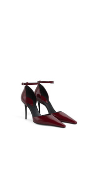 DETAILS D'Orsay pumps with lacquered stiletto heel Thin ankle strap Drop shaped heel base 90 mm heel Slightly crinkled shiny calfskin leather Made in Italy MATERIALS Highlights MAIN MATERIAL: 100% CALFSKIN LEATHER MAIN LINING: 95% LAMBSKIN LEATHER, 5% GOATSKIN LEATHER SOLE: 70% RUBBER, 30% CALFSKIN LEATHER HEEL: 100% ACRYLONITR BUTADIENE STYR BUCKLE: 100% ZAMAK PRODUCT REFERENCE: AA3E1021I135-303